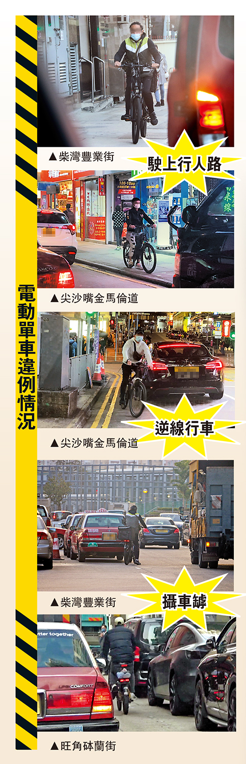 (大公報記者 余風、蘇荣、盧剛昌)電動單車滿街飛馳,不幸撞傷途人,傷者難獲保險賠償。很多外賣員為求將客人的餐點熱辣辣送到,貪方便使用仍未合法的電動單車送外賣。大公報記者連日在各區直擊,發現在晚飯黃金時段,尖沙咀每小時便有近20部外賣電動單車「剷」上行人路,在鬧市中左穿右插,明顯違反交通規例。