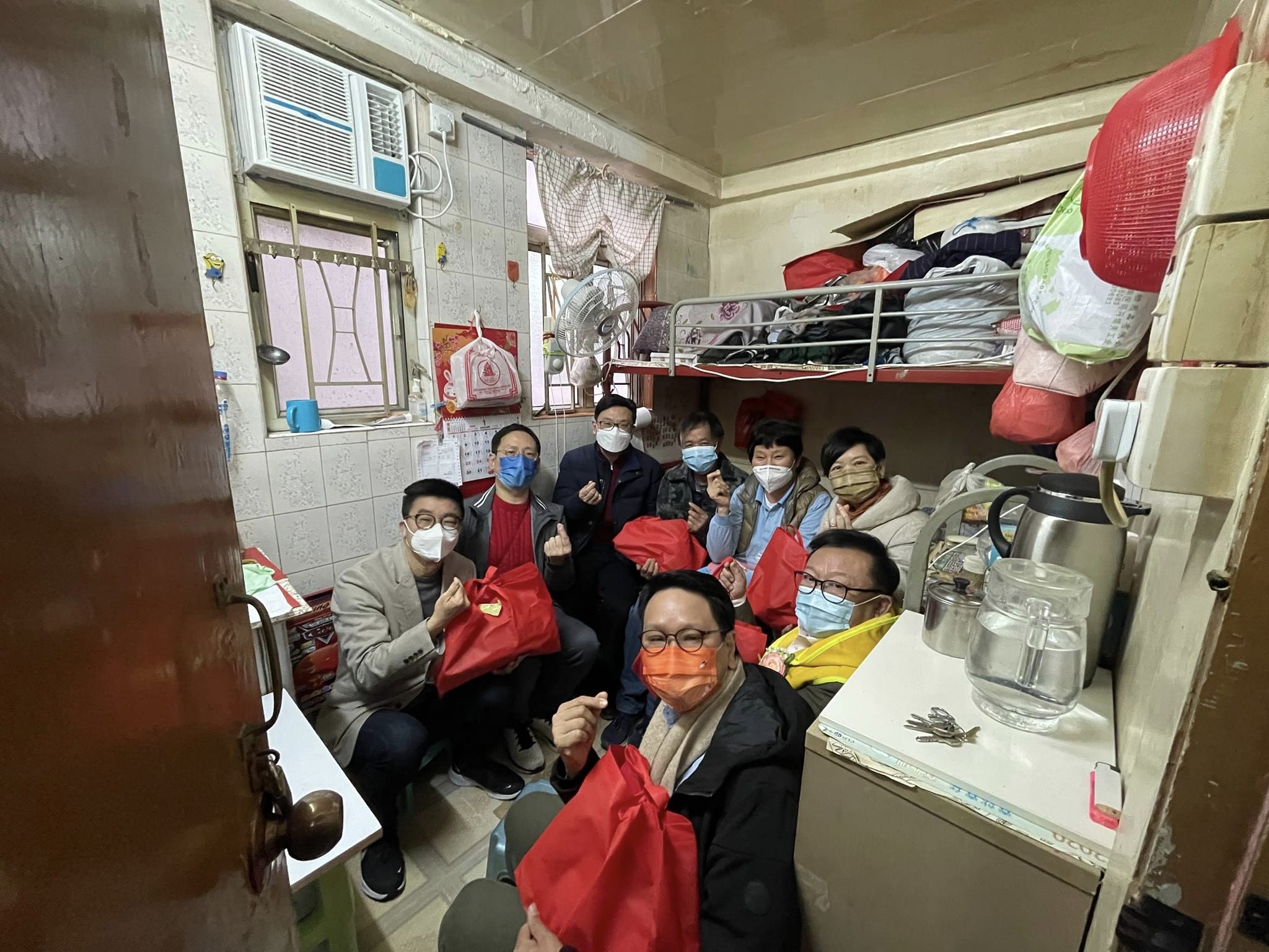 他們走入劏房,了解居民生活,介紹政策,包括簡約公屋及現金津貼等,又送基層家庭賀年福袋。柯創盛稱,落區家訪能讓官員掌握社情民意。他又稱,見到有劏房戶天花剝落、 電線外露等情況,促請當局關注和跟進。