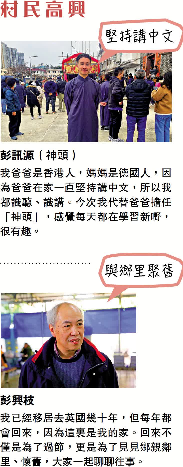 「神頭」之中,59歲的彭慶年亦是特地從英國回來擔任這角色,「出國是為咗搵食,但這裏始終是我的根。」他笑言26歲便登記「神頭」,今年終於輪到,「很興奮、很光榮,晚上要請鄉親們食盆菜!」另一位年輕的外國面孔頗為矚目,27歲的彭訊源說,父親是圍村人,自己在德國長大,但因為父親在家一直堅持講中文,自己的廣東話亦十分流利,他亦每年隨父親一同回到圍村,「同德國的生活係完全不同」。