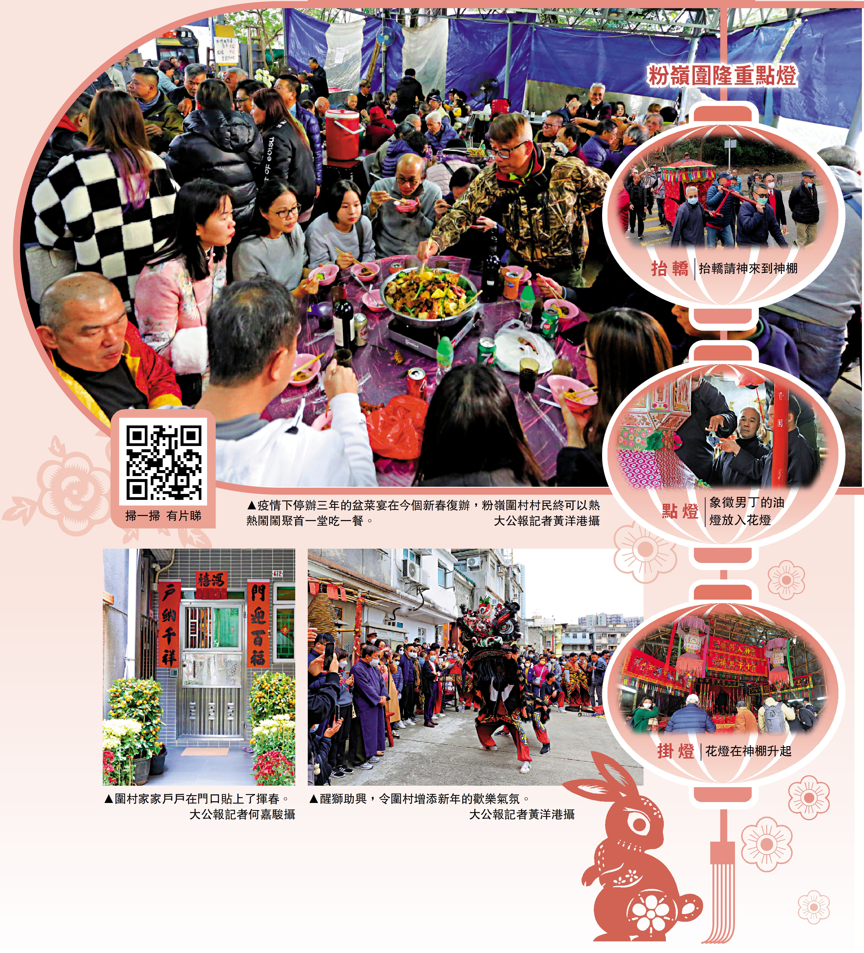(大公報 記者 邵穎、黃洋港)今個春節廣大市民開心團圓。在社會復常的氛圍帶動下,不少在疫下停辦多年的傳統習俗活動復辦。在粉嶺的粉嶺圍,疫下停辦三年的盆菜宴今年重啟,筵開二十多席,新春的圍村重現熱鬧氣氛,吃過盆菜宴大家團結奮進、豐衣足食;而疫下從未中斷的「點燈」儀式今年氣氛更足,鑼鼓聲震天,不少移居海外多年的原居民特地回來參加。