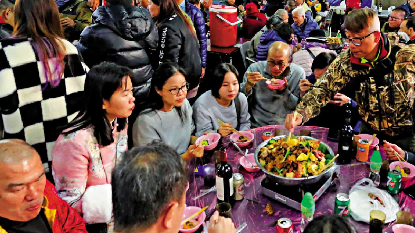 「好耐冇試過一大班人咁食!」限聚令撤銷了,社交距離措施都已放開了,在粉嶺圍祠堂,昨日年初四下午五時,村中的祠堂、士多擺滿酒席,圍村內的數百名村民們聚首一堂,一邊圍爐吃盆菜,一邊談天說地,樂也融融。
