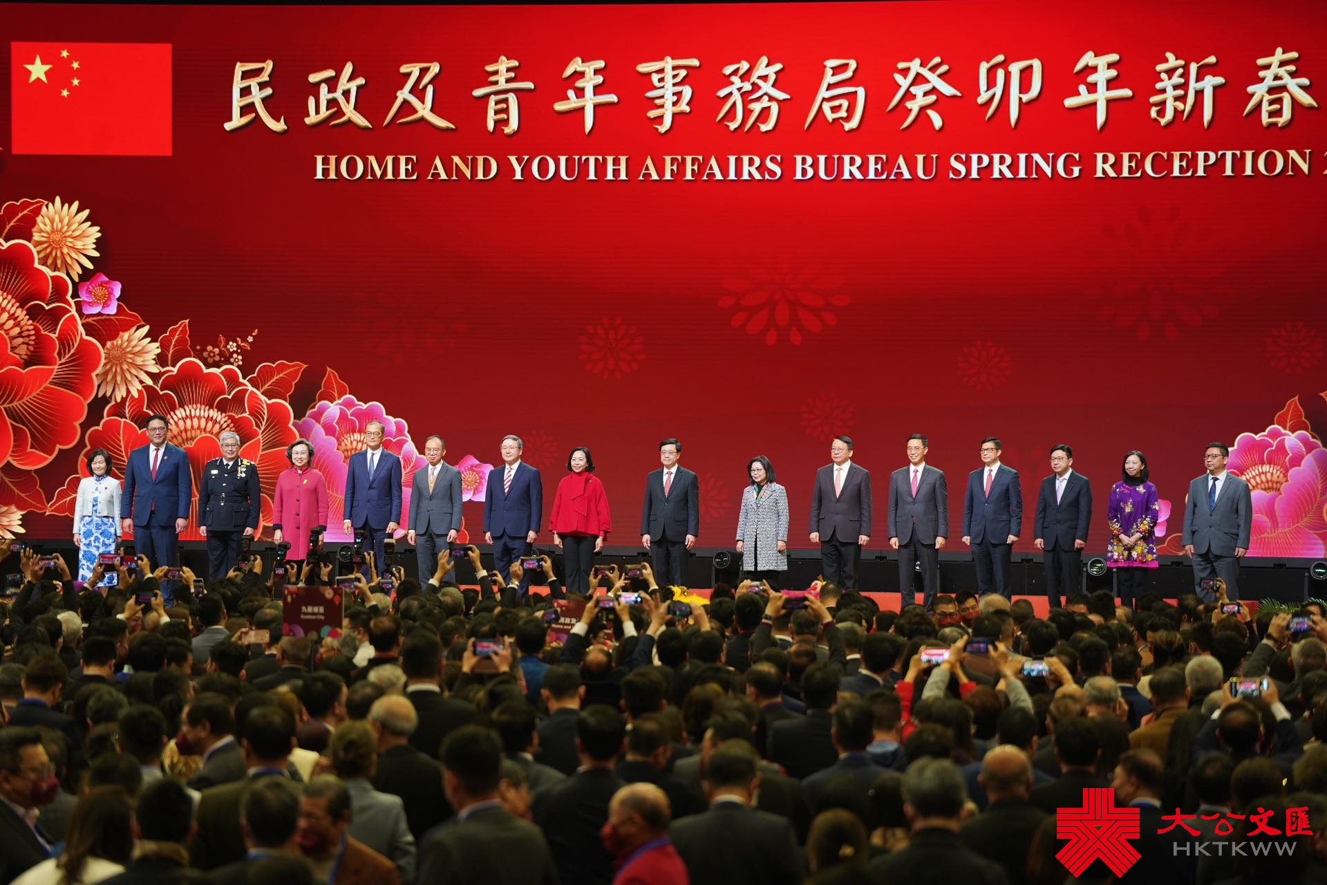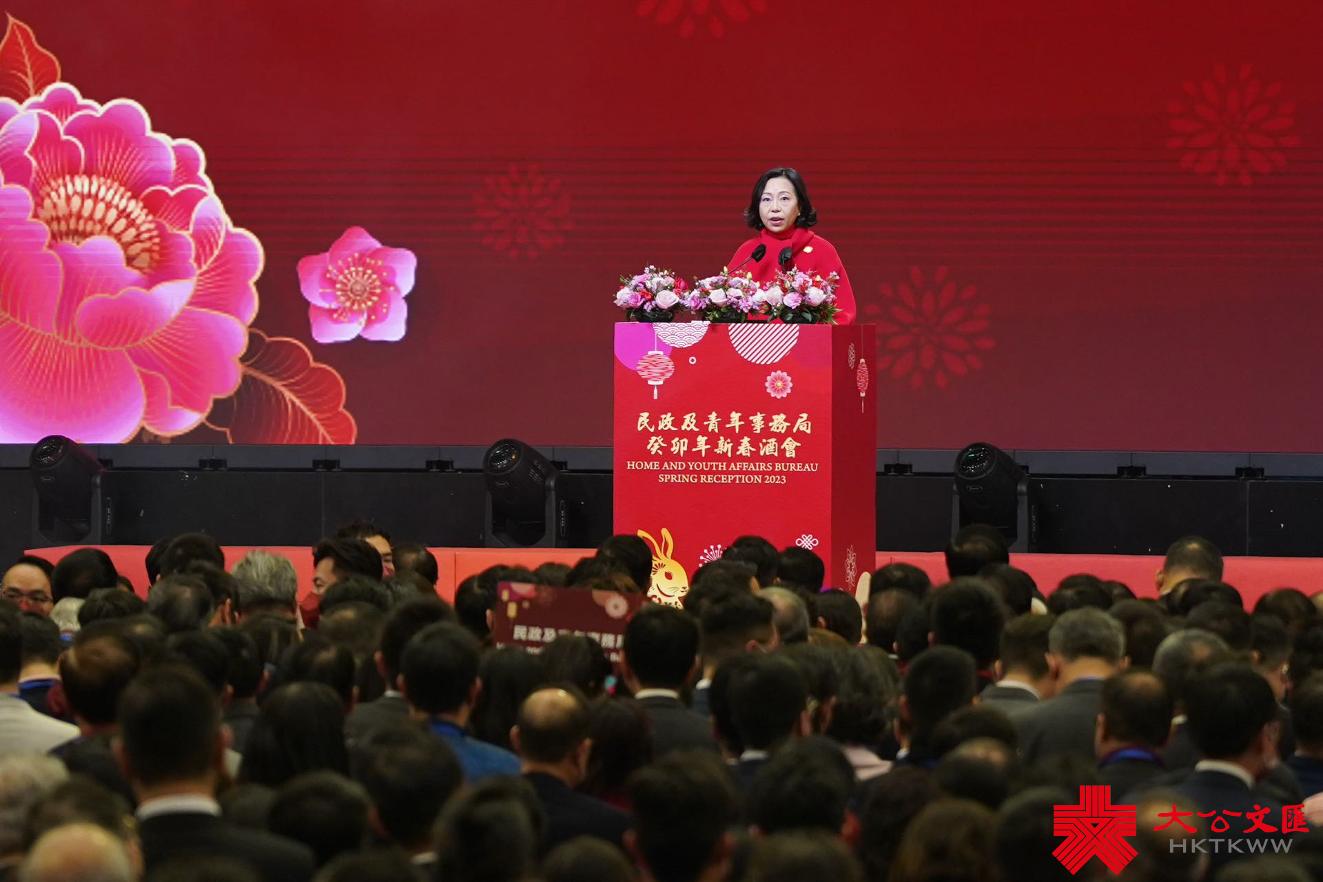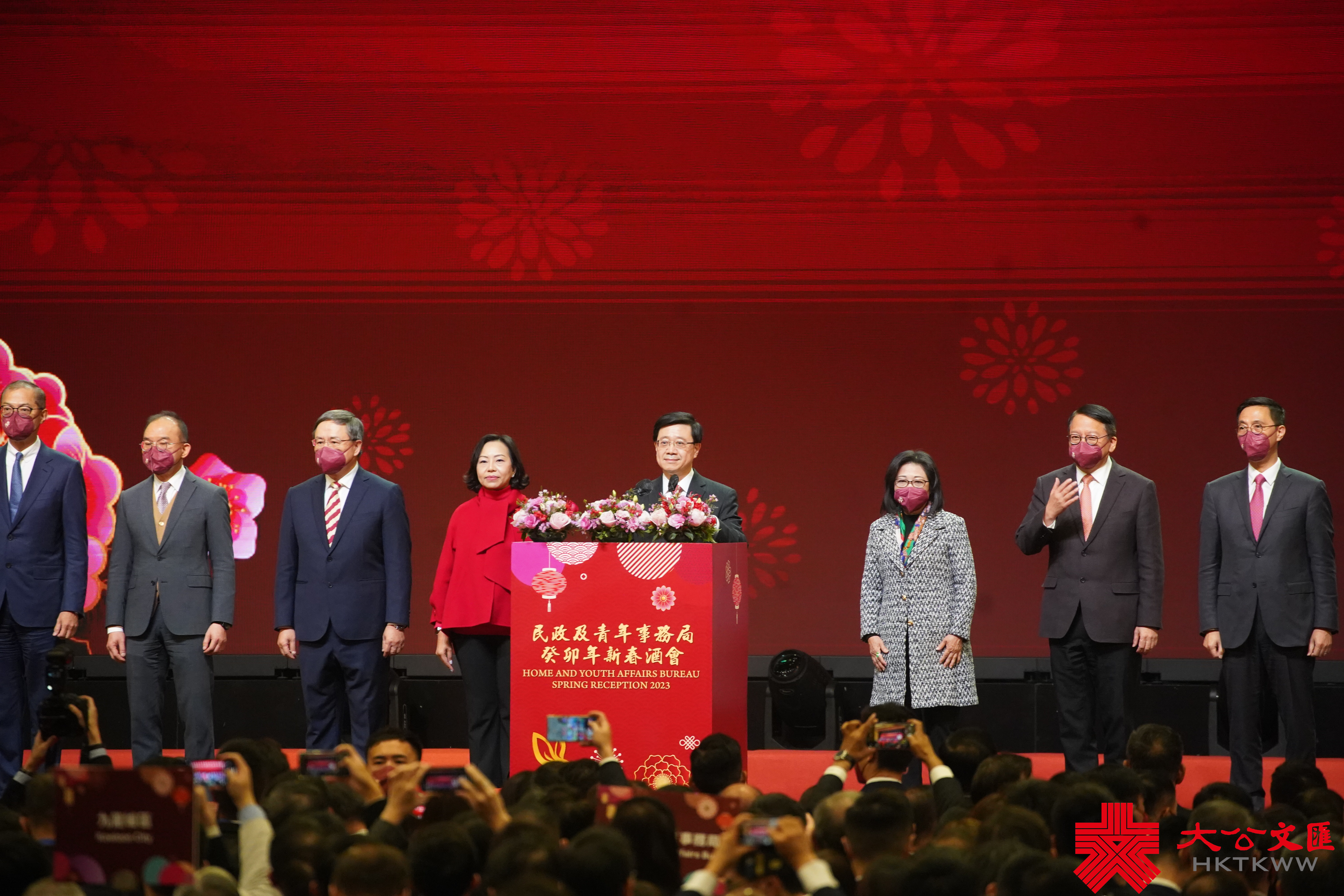 (大公文匯全媒體記者 康敬)民政及青年事務局癸卯年新春酒會今日(27日)在灣仔會展中心舉行,香港特區行政長官李家超與夫人林麗嬋出席酒會,多位政府官員以及全港18區數千代表歡聚一堂共賀兔年新春。疫情三年以來首次復辦新春酒會,民青局局長麥美娟表示,隨着香港恢復有序全面通關,經濟及社會活動進一步復常復甦,新一年的香港將會是萬象更新、生機處處。