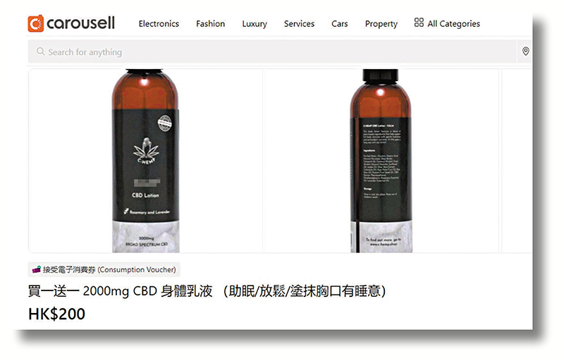 海關昨日舉行記者會提醒市民,CBD將於下周三起受到《危險藥物條例》的嚴格管制。新法例實施後,香港海關將嚴厲執法,打擊有關販毒活動(見另稿)。香港文匯報記者昨日在網上買賣平台Carousell查詢出售大麻二酚產品情況,發現有大量含該成分的各類產品開售,如昨日就有人開售一款CBD乳液,標明有2,000毫克高含量CBD,聲稱能促進皮下血液循環,有預防皮膚老化等效果,可面交或快運取貨。還有來自法國巴黎的含CBD成分香水,100毫升索價800元,可在港鐵土瓜灣或旺角站交收。
