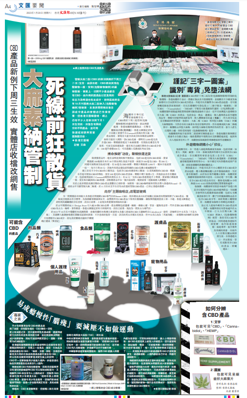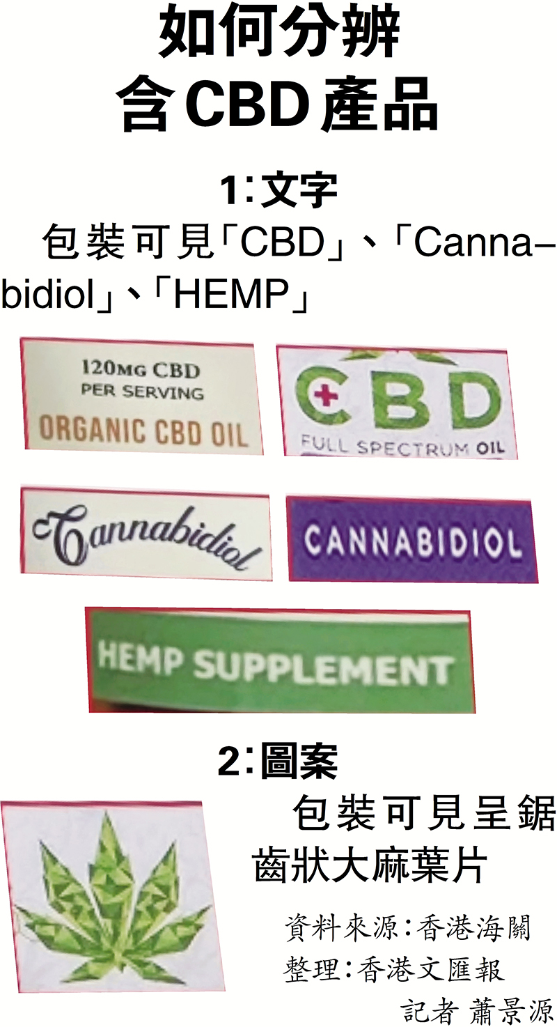 CBD將於下周三成為受《危險藥物條例》管制的危險藥物,香港海關昨日表示,將嚴正執法及不設緩衝期,並提醒在不少國家及地區都可以合法買到含CBD成分產品,外遊市民若攜帶含CBD產品返港,有可能會觸犯販毒罪而被拘控。市民在選購時可憑包裝上「三個字眼及一個圖案」,即「CBD」、「Cannabidiol」、「HEMP」字眼及大麻葉圖案作識別,以免誤墮法網。