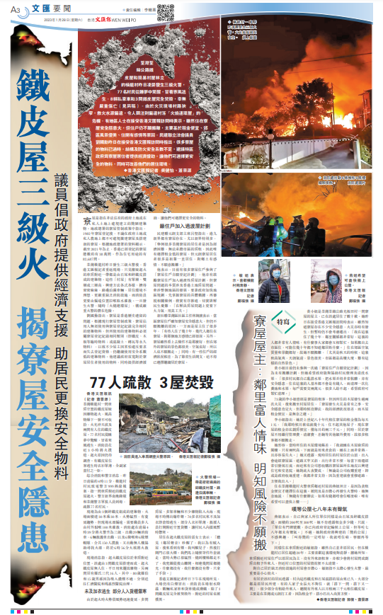 (香港文匯報記者 吳健怡、蕭景源)荃灣荃錦公路鐵皮屋和簡易村屋林立的橫龍村昨日凌晨發生三級火警,77名村民從睡夢中驚醒,冒着寒風逃生。8輛私家車和3間鐵皮屋完全焚毀,幸無嚴重傷亡。由於火災現場村路狹窄,救火水源偏遠,令人關注到偏遠村落「火燒連環屋」的危機。有地區人士在接受香港文匯報訪問時表示,雖然住在寮屋安全隱患大,但住戶仍不願搬離,主要基於租金便宜、郊區風景優美、住開有感情等原因。民建聯立法會議員劉國勳昨日在接受香港文匯報訪問時指出,很多寮屋的物料已過時,結構及防火安全系數不足,建議特區政府為寮屋居住者提供經濟援助,讓他們可選擇更安全的物料,同時可改善他們的居住環境。