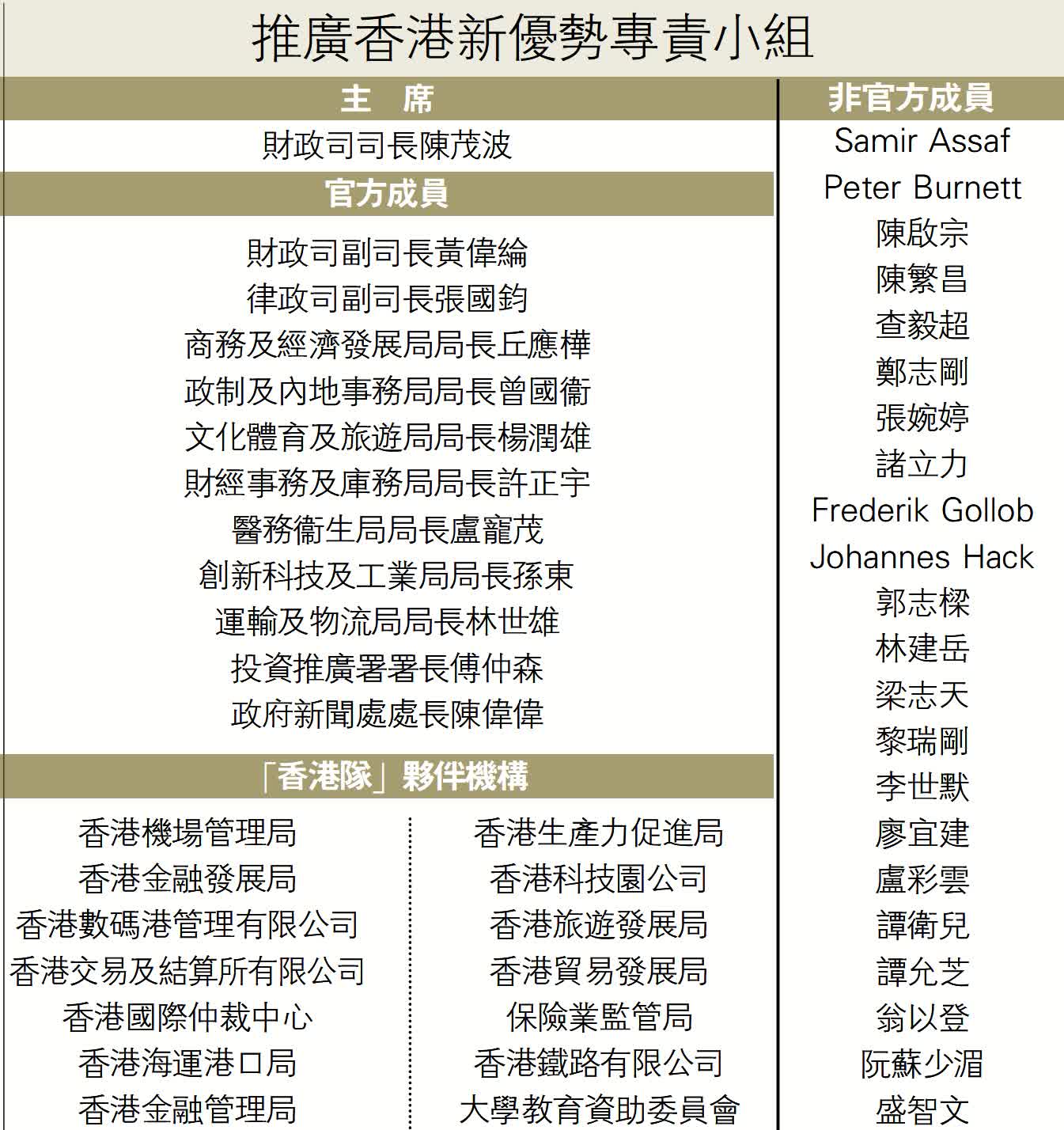 專責小組成員除了官方成員外,還涵蓋政、商、學及文化界等不同界別傑出人士,包括恒隆地產董事長陳啟宗、蘭桂坊集團主席盛智文、香港電視廣播有限公司大股東黎瑞剛、貿易發展局主席林建岳、新世界集團行政總裁鄭志剛、大律師公會前主席譚允芝、導演張婉婷等。