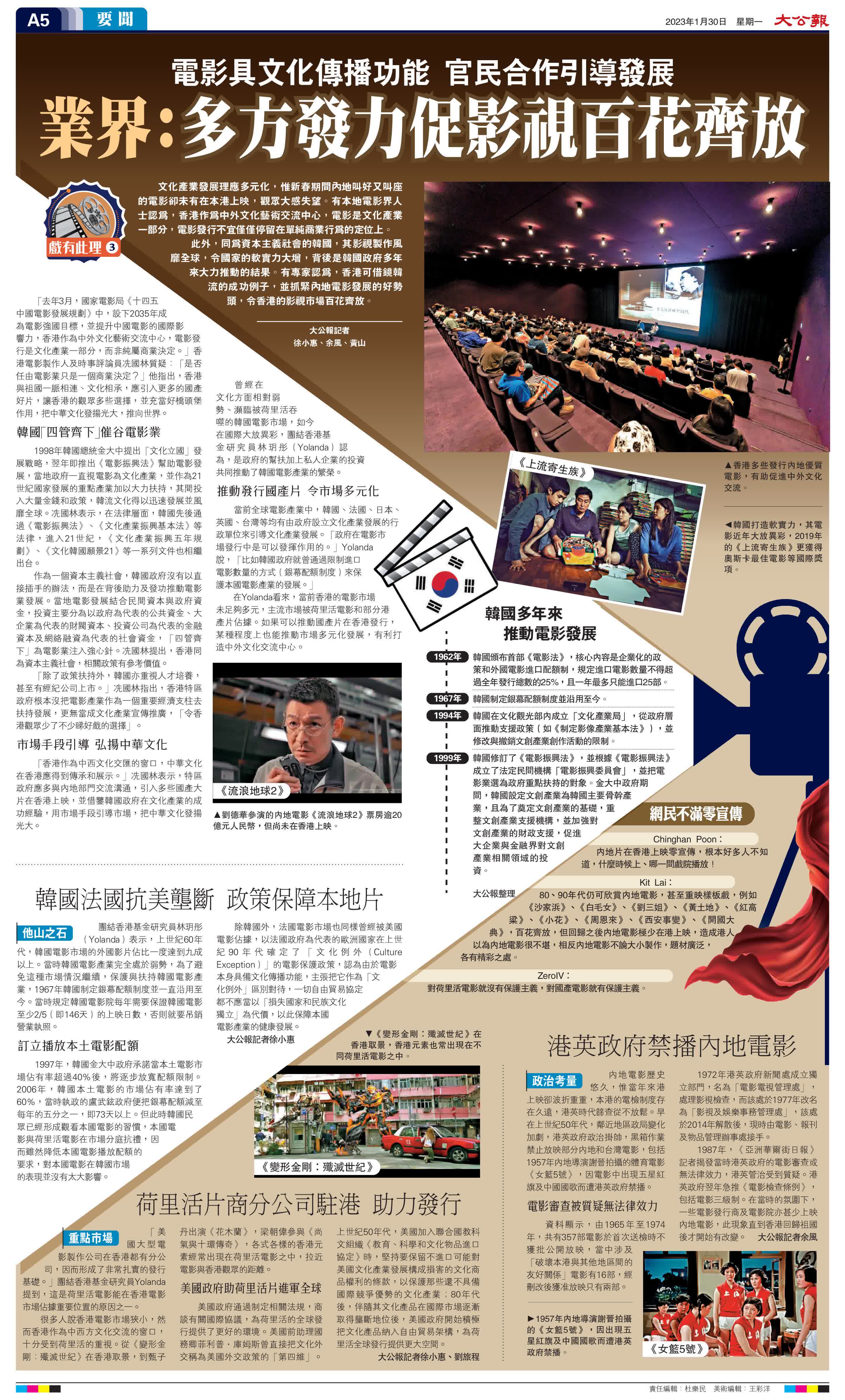 「除了政策扶持外,韓國亦重視人才培養,甚至有經紀公司上市。」冼國林指出,香港特區政府根本沒把電影產業作為一個重要經濟支柱去扶持發展,更無當成文化產業宣傳推廣,「令香港觀眾少了不少睇好戲的選擇」。