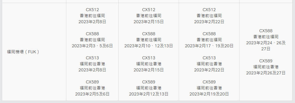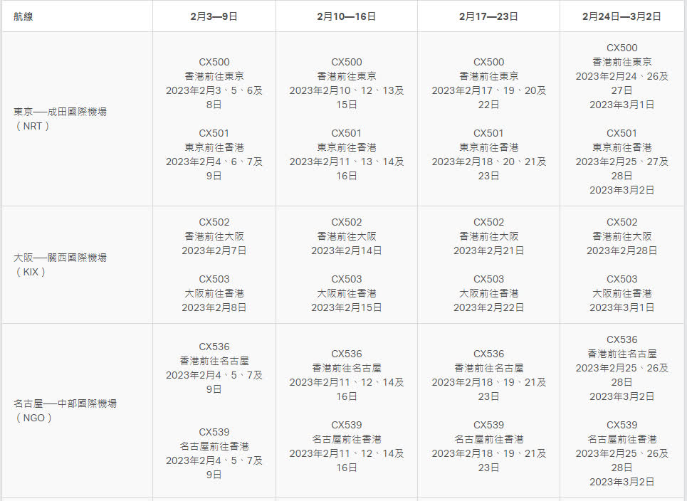 國泰航空將取消以下由2月3日至3月2日往返香港及日本的共98班次航班: