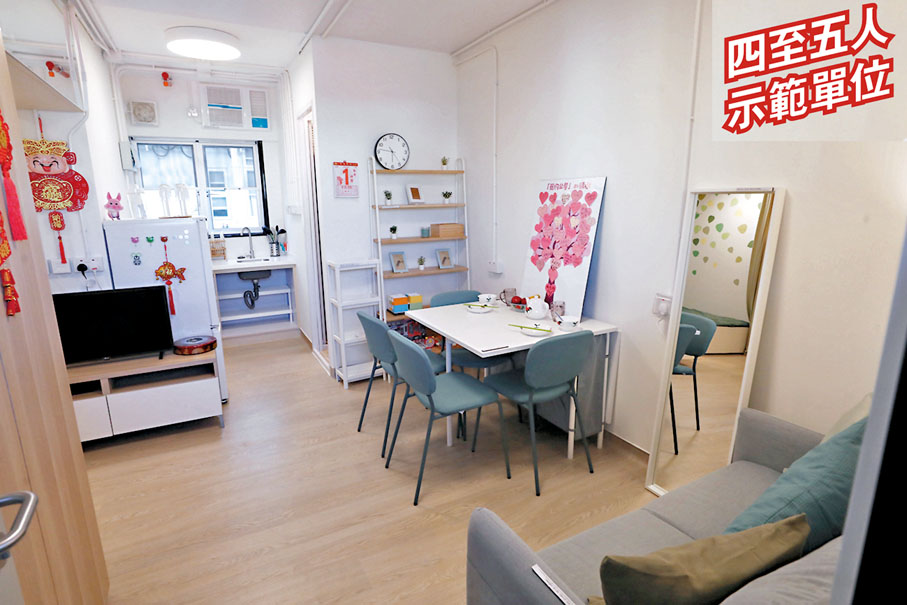 該「簡約公屋」示範單位設於啟德社區隔離設施,據了解,建築署特地把隔離設施單位改裝成330呎,大小與「簡約公屋」項目的四至五人大單位一樣。香港文匯報記者昨日走進示範單位內,只見中間有木板簡單分隔客飯廳與睡的空間,記者身處的位置為客飯廳,進門後靠牆位置放了一張能容納二人的小型沙發,前方貼牆位置放了一張飯桌,足夠四人同時用膳;如把飯桌拉離貼牆位置,用盡四面位置,可容納多兩人一同進食。