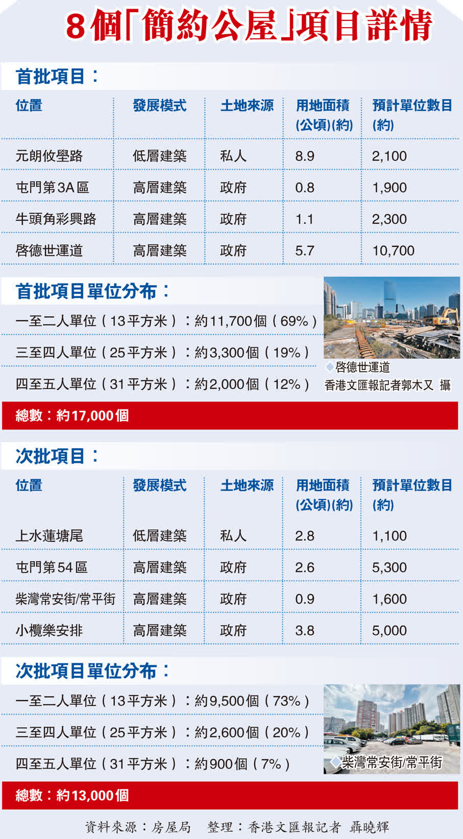 房屋局局長何永賢昨日公布4個「簡約公屋」項目的選址,分別位於啟德世運道、牛頭角彩興路、柴灣常安街/常平街、小欖樂安排,連同之前公布的選址合共有8幅地。其中,世運道佔地約5.7公頃、可提供約10,700個單位,為最多單位的項目。