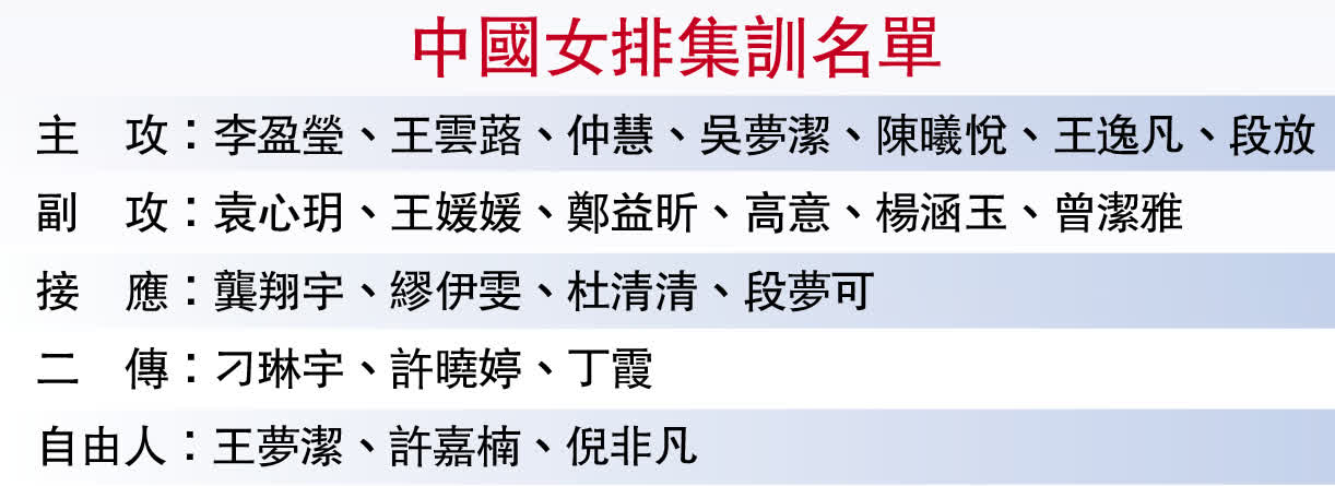 跟去年中國女排的陣容相比,主攻位置的人員變化較大。來自北京隊的主攻手金燁這次沒有入選,段放、仲慧、王逸凡、陳曦悅與李盈瑩、王雲蕗、吳夢潔一起入選。在接應位置上,出生於2005年、身高1米98的小將段夢可榜上有名。