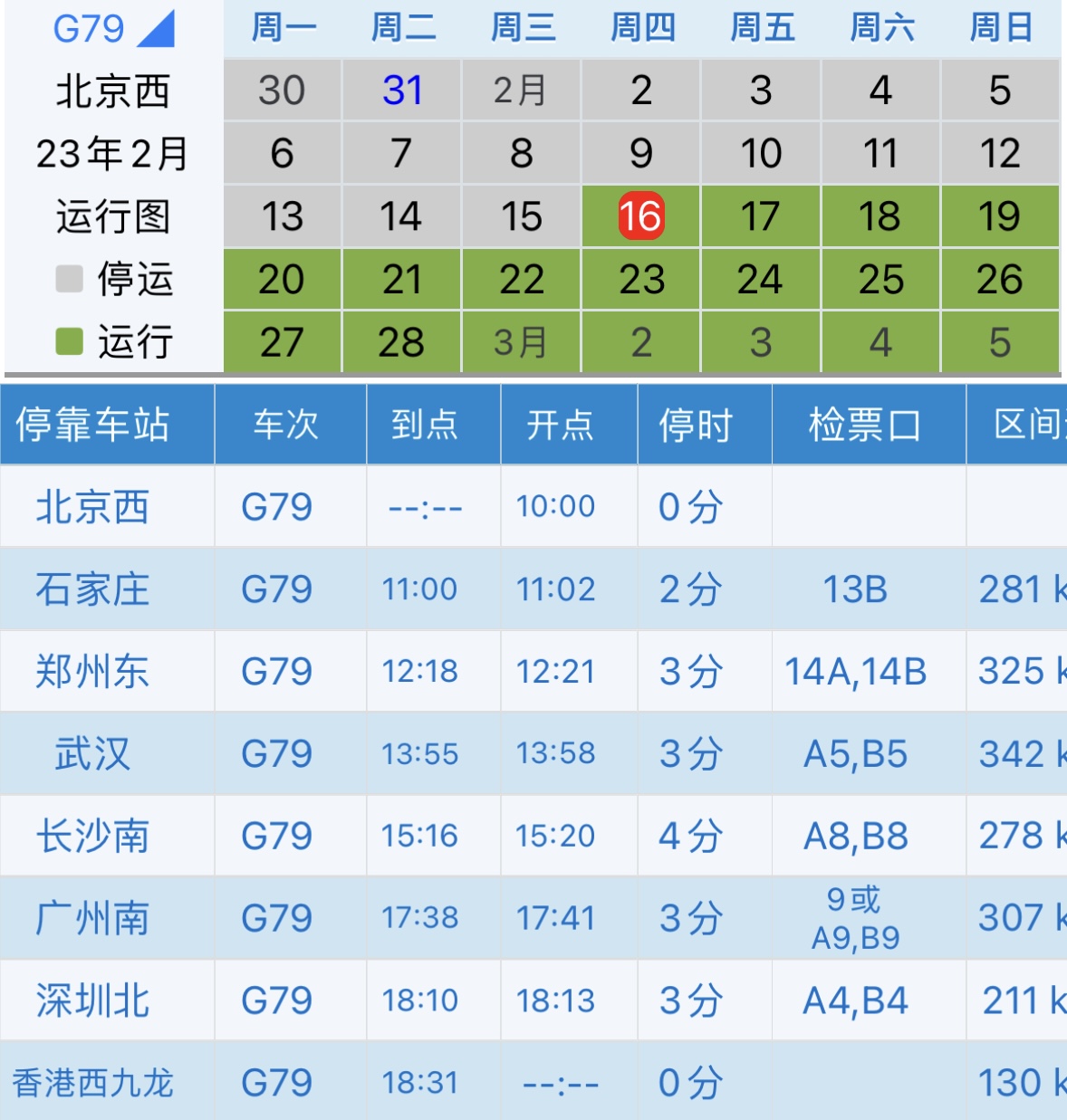 大公文匯全媒體記者在名為「路路通時刻表」的應用程式中查詢車次時發現,2月16日開始可以查詢到部分連通香港西九龍站與廣東省外的高鐵車次。「路路通」應用程式內數據顯示,G79次列車原本為北京至福田往返運營,但是從2月16日起,G79次列車將改為北京至香港西九龍站往返,單程時間為8小時31分。除此之外,從天津西始發的G305次列車也於2月16日起設置終點站為香港西九龍站。