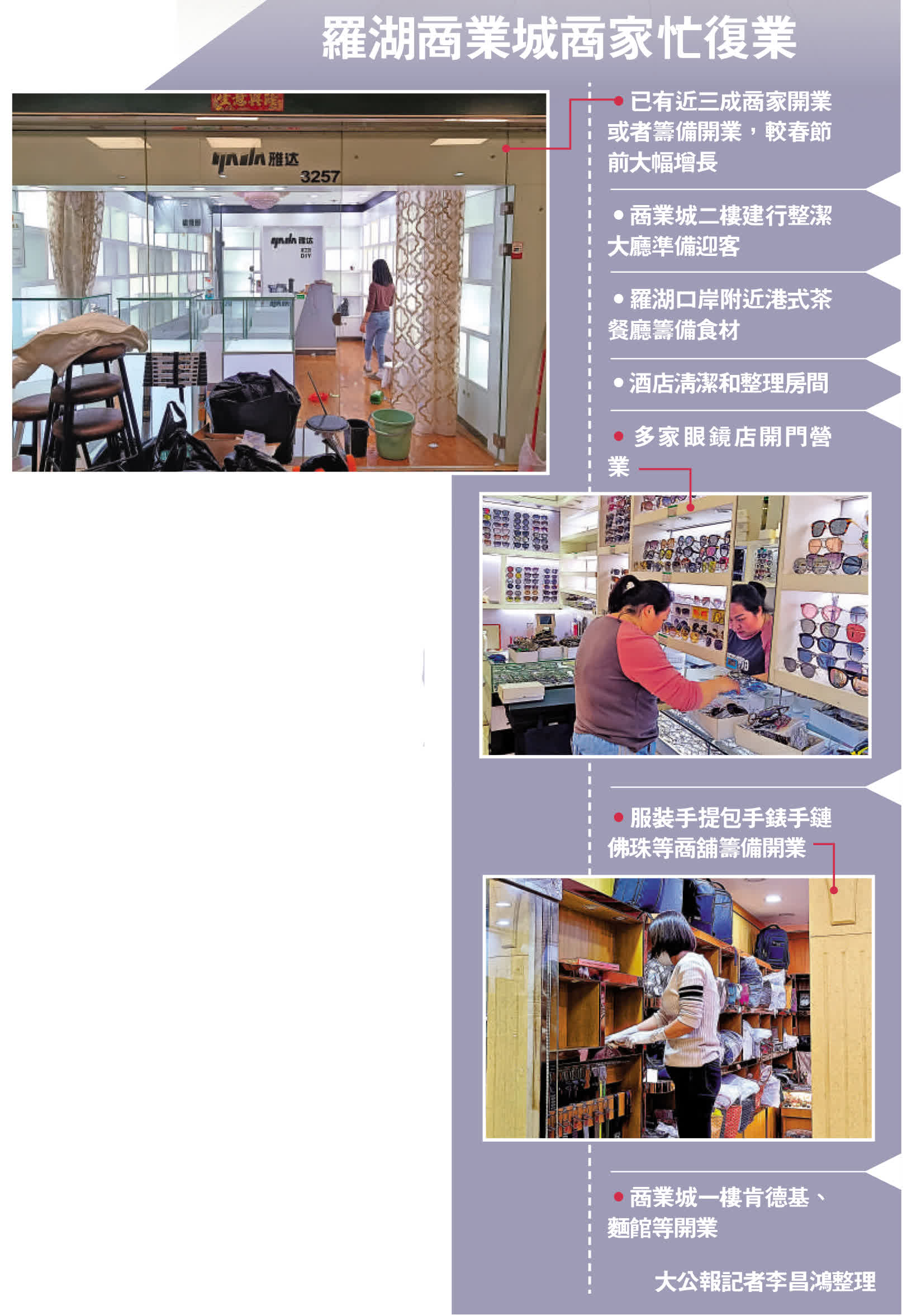 (大公報記者 李昌鴻)在福田和文錦渡等口岸恢復正常通關後,各界對於羅湖口岸2月初通關也給予很大期望。記者1月31日下午在羅湖商業城看到,許多商家前來店舖整理櫥窗和貨品,清潔衞生,籌備開業。記者粗略估算,準備開業的商家大約佔到總數三成左右。一位江西籍商戶曾先生向記者表示,終於盼到了這一天,雖然不知道具體通關日期,但只要盡快開關,生意一定會好轉,為此夫婦倆忙於整理眼鏡,期待港人和外國遊客帶來的銷售機會。