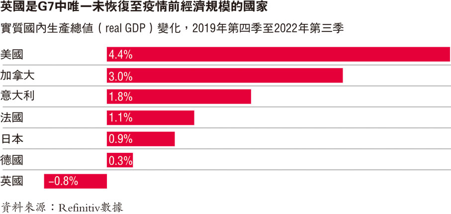 (香港文匯報特約記者 周天梧 倫敦報道)英國於2020年1月31日深夜正式脫離歐盟,至今已經滿3年。當日時任英國首相約翰遜曾經揚言,英國脫歐後終於可以「釋放全部潛力」,同時英國人「在國內外的信心都會逐漸增強」,但3年過去,英國經濟始終都未能享受所謂的「脫歐紅利」,經濟各個領域更逐漸落後於其他發達國家,國際貨幣基金組織(IMF)最新報告更預測,英國將會是七國集團(G7)當中,唯一一個在今年出現經濟收縮的國家。