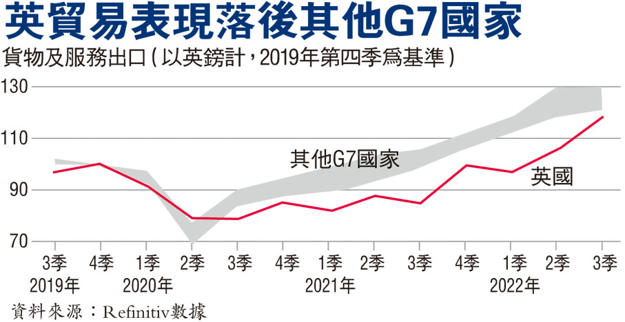 以出口為例,脫歐派當初宣稱英國脫歐後可以成為「全球英國」,能夠有助英國商品出口到歐洲以外的全世界,但數據顯示,過去3年英國出口,尤其是貨物出口增長遠少過其他G7國家。評級機構標準普爾高級經濟師格拉斯表示,英國與歐盟之間的貿易手續增多,大大打擊英國小型製造商的競爭力,而且英國的小型製造商數量遠多於法國和德國,令英國在脫歐後承受更大打擊。他說:「當你是一家只有20人的小型出口商,要找人手來處理大量出口文件的成本就會非常龐大,一些企業甚至完全無法競爭。」