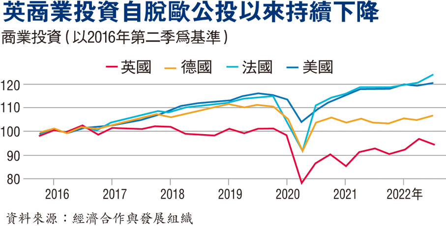 脫歐打擊海外商界對英國前景的信心,導致英國獲得的商業投資大減,數據顯示,自2016年脫歐公投以來,英國商業投資總額一直接近零增長,過去3年更是少過2016年,表現遠差過美國、德國甚至法國。