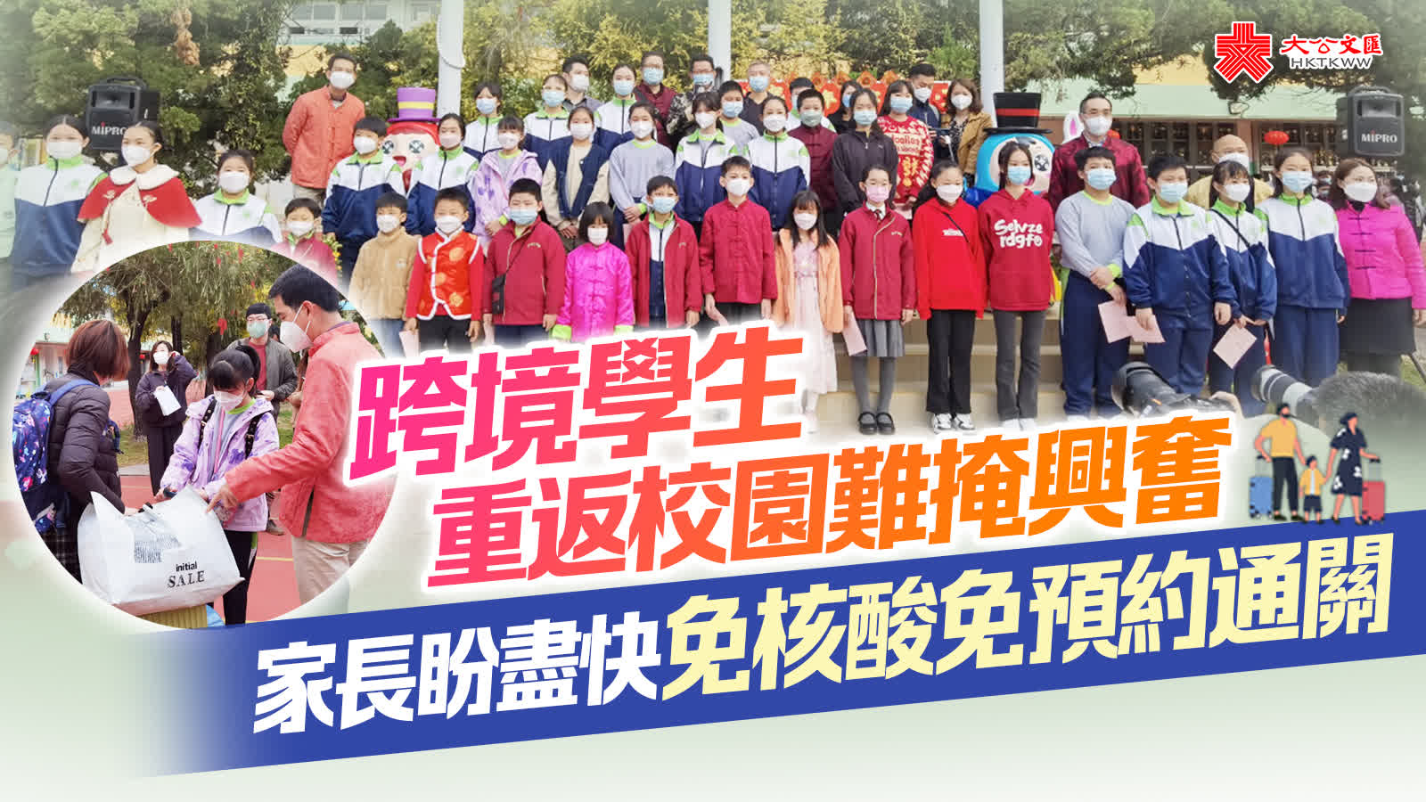 (大公文匯全媒體 記者 李九歌)受到新冠肺炎影響,香港學校一度暫停面授課堂,學生需改上網課,可後來即使疫情放緩,受到兩地防疫措施的限制,跨境學生仍然無法來到香港,被迫繼續上網課。上水鳳溪第一小學今日(2月1日)有跨境學童,以申請過關名額及做核酸檢測的方式率先回港上課,校方今日亦籌備新春文化日,歡迎學生回到學校。
