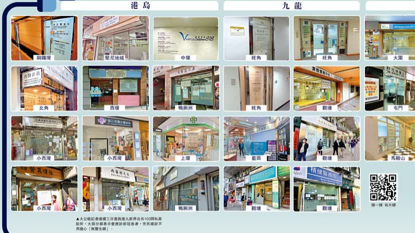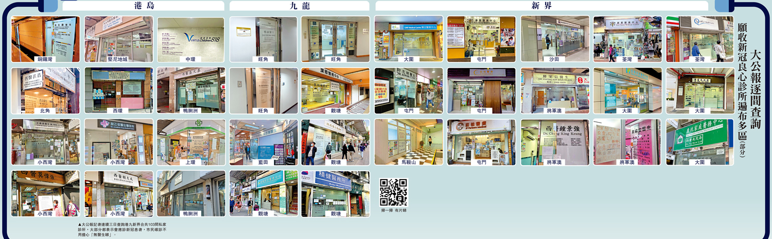 大公報記者調查私家醫生對診治新冠患者的情況,連續三天實地走訪全港多區。在西環駐診的西醫陳伯行,該診所的護士表示陳醫生親自診治新冠患者,診金連兩天藥費為300元,與普通傷風感冒診金收費無分別。同區西醫陳祖彥的護士說,新冠患者診金連三日藥費為400元,病人需提供快測確診相片。西醫李漢鈞的護士稱,新冠患者診金為350至390元,與傷風感冒診金無異。西醫許晏冬的護士說,新冠患者收費420元,藥費另計。