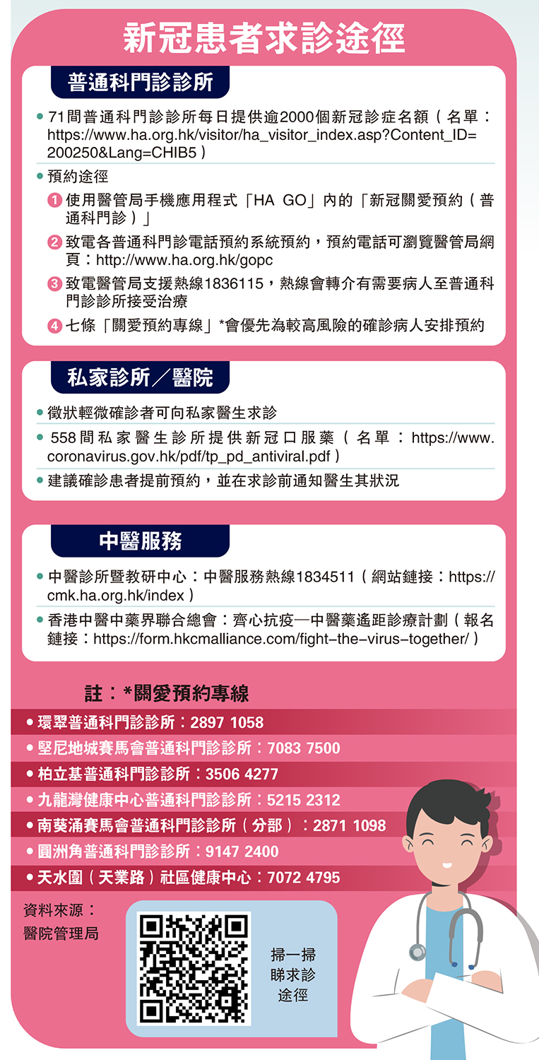 (大公報記者 曾敏捷、余風、盛德文、調查組、攝影組、邵穎、王亞毛、賴振雄、編輯組)社會邁向復常,特區政府在1月30日起撤銷隔離令安排,醫院管理局取消指定診所及遙距診症服務,新冠確診患者求診情況備受關注。在復常安排下,新冠患者是否求診無門?向私家醫生求診是否要捱貴藥?醫管局門診是否被新冠患者迫爆?