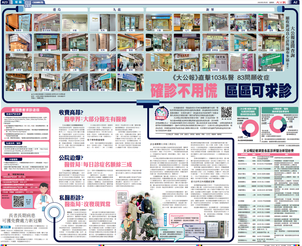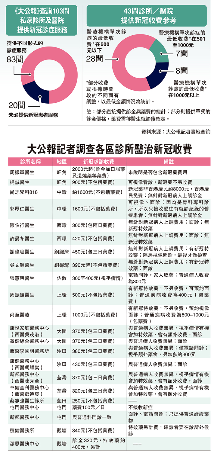 大公報記者以確診患者親友身份,連續三日走訪查詢,得知全港103間私家診所及醫院對新冠患者的求診安排,其中83間診所或醫院表示,可為確診者提供不同方式的診治,顯示患者求診「區區有得睇」。43間有提供收費標準參考的醫療機構中,逾65%的單次診症最低收費在500元以下,大部分表示新冠診症收費與一般診症無異,但藥費或會視乎病情及處方藥物日數有分別。至於醫管局普通科門診的新冠診治名額,每天仍有約30%餘額。
