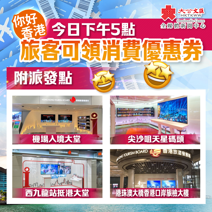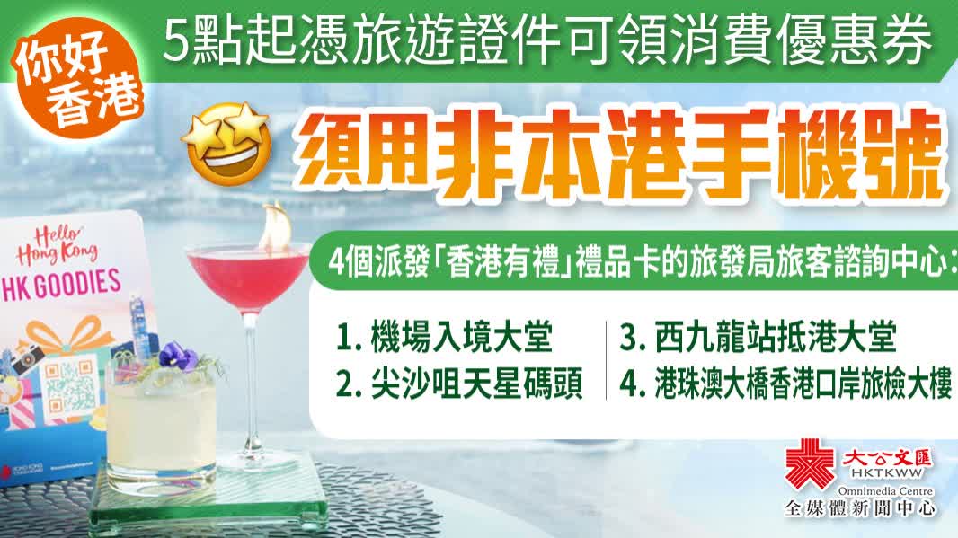 大公文匯全媒體報道,「你好,香港!」啟動禮今日(2日)舉行,為一連串向全世界說好香港故事,推廣香港商機、文化景點及旅客體驗的活動揭開序幕。旅發局總幹事程鼎一在記者會上表示,旅客獎賞方面,旅發局會提供至少100萬份「香港有禮」—旅客消費優惠券,每份價值至少港幣100元,在參與的酒吧、餐廳和酒店享用迎賓飲品,或於交通工具、餐飲、零售、商戶及景點兌換獎品。「香港有禮」由今日下午5時起,會在4個地點向訪港旅客派發,分別是尖沙咀天星碼頭、西九龍站抵港大堂、機場入境大堂、港珠澳大橋香港口岸旅檢大樓。