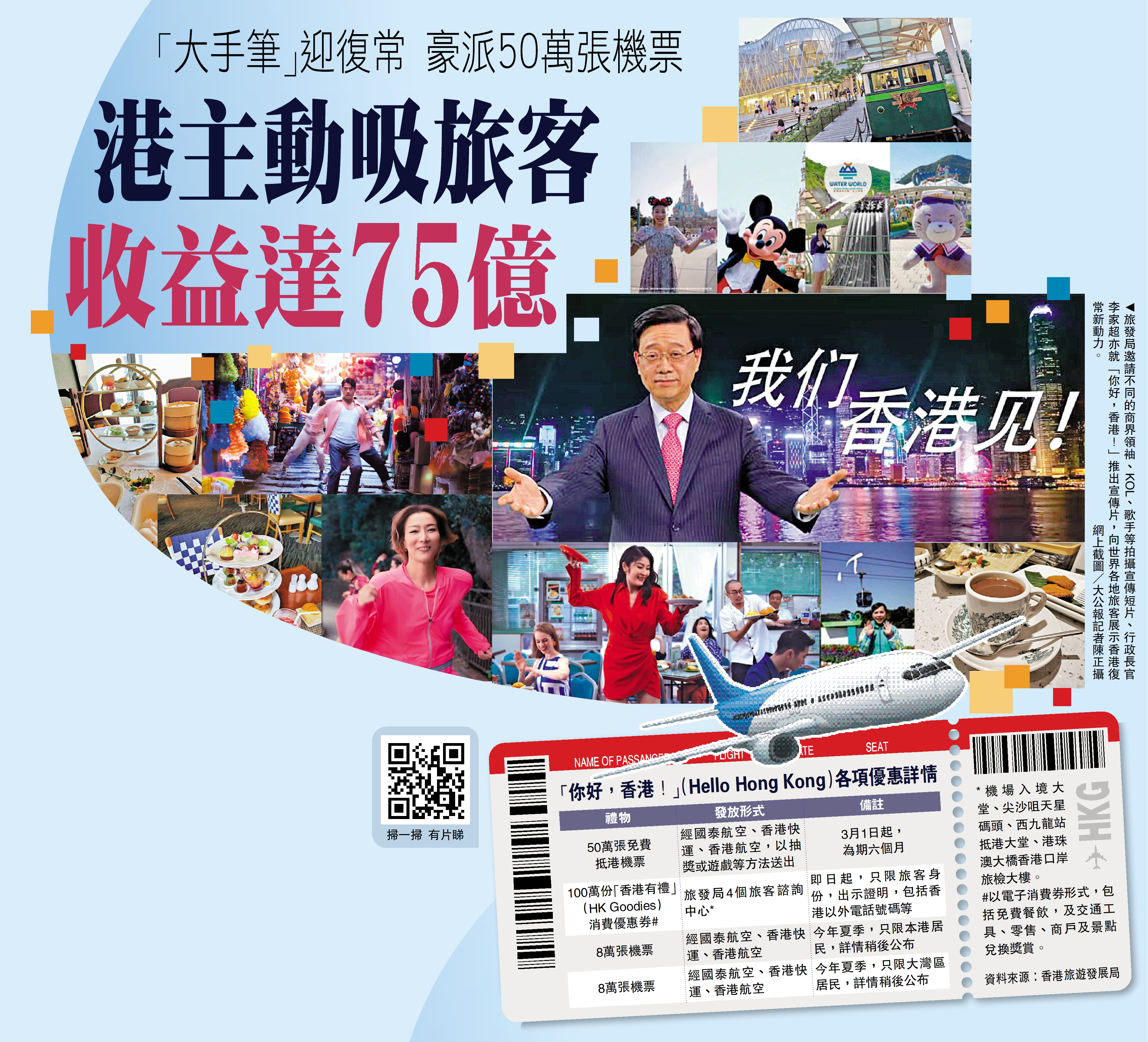 (大公報記者 賴振雄 邵穎)經歷三年新冠疫情,香港步入復常階段,重返國際舞台。行政長官李家超昨日宣布啟動「你好,香港!」(「Hello Hong Kong」)大型宣傳活動,讓世界重新了解香港。活動包括下月起向全球旅客送贈50萬張機票,為期六個月,料可吸引150萬人次來港旅遊;今年夏季向大灣區及本港居民各送贈8萬張機票,鼓勵旅客多使用香港機場。