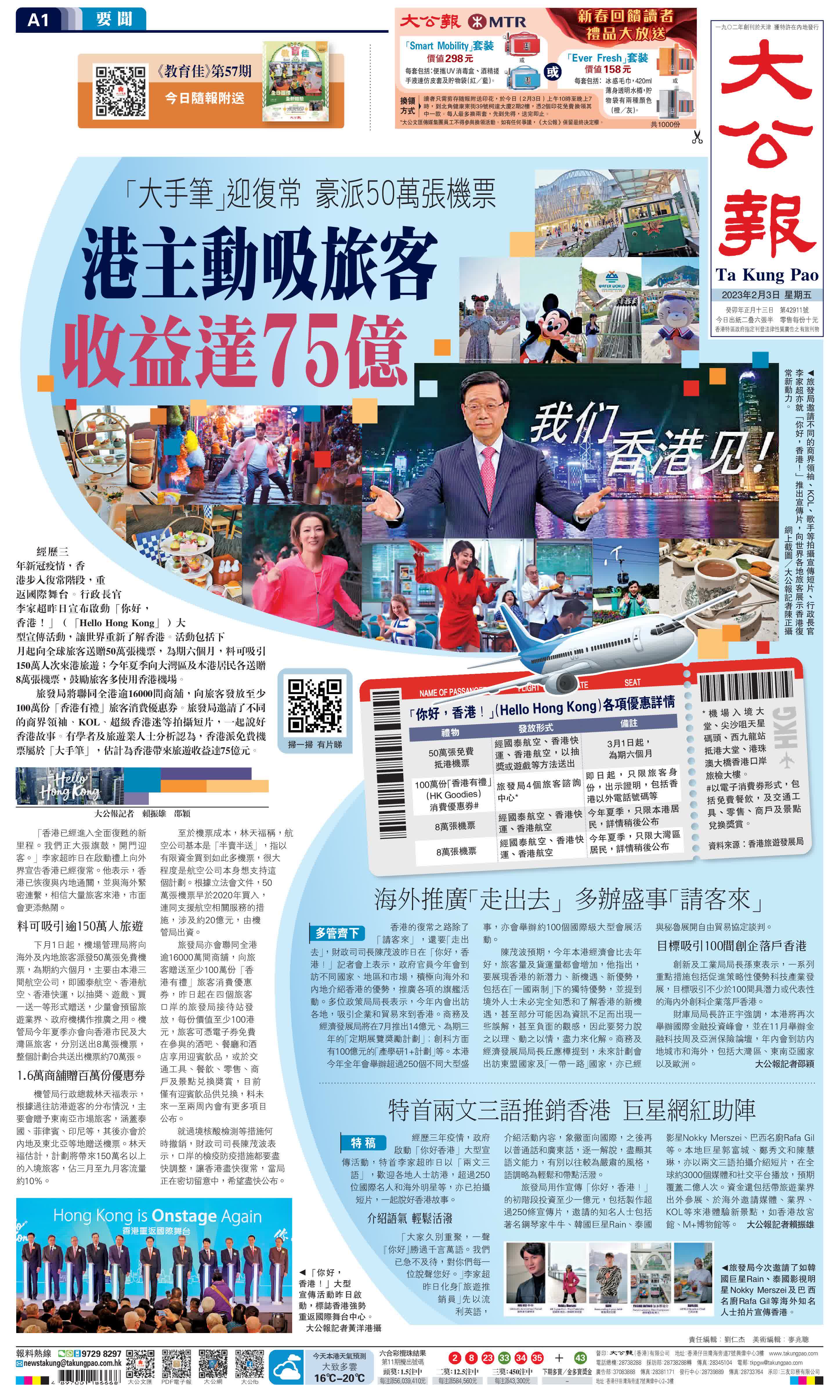 旅發局用作宣傳「你好,香港!」的初階段投資至少一億元,包括製作超過250條宣傳片,邀請的知名人士包括著名鋼琴家牛牛、韓國巨星Rain、泰國影星Nokky Merszei、巴西名廚Rafa Gil等。本地巨星郭富城、鄭秀文和陳慧琳,亦以兩文三語拍攝介紹短片,在全球約3000個媒體和社交平台播放,預期覆蓋二億人次。資金還包括帶旅遊業界出外參展、於海外邀請媒體、業界、KOL等來港體驗新景點,如香港故宮館、M+博物館等。(來源:大公報A1:要聞 2023/02/03)