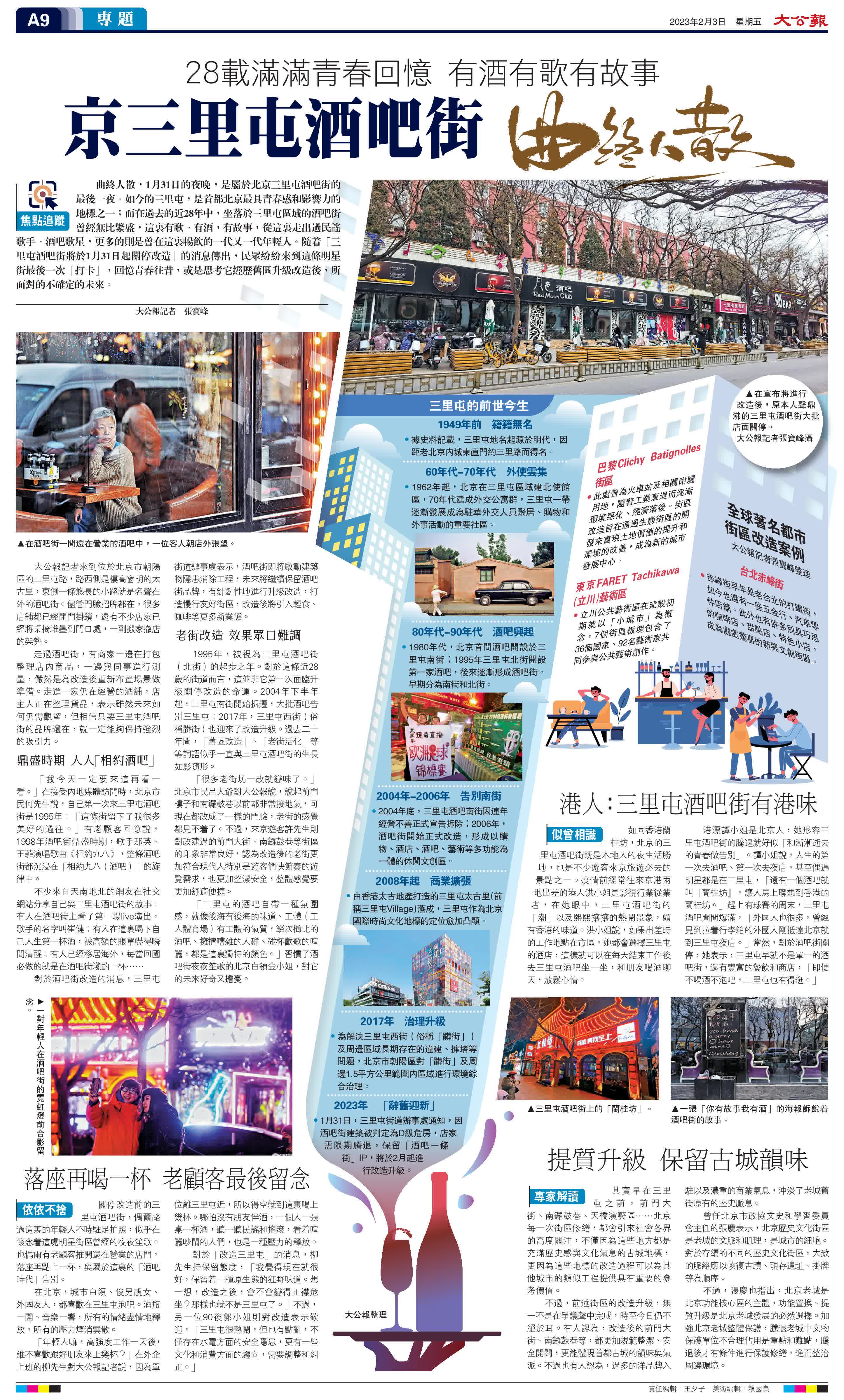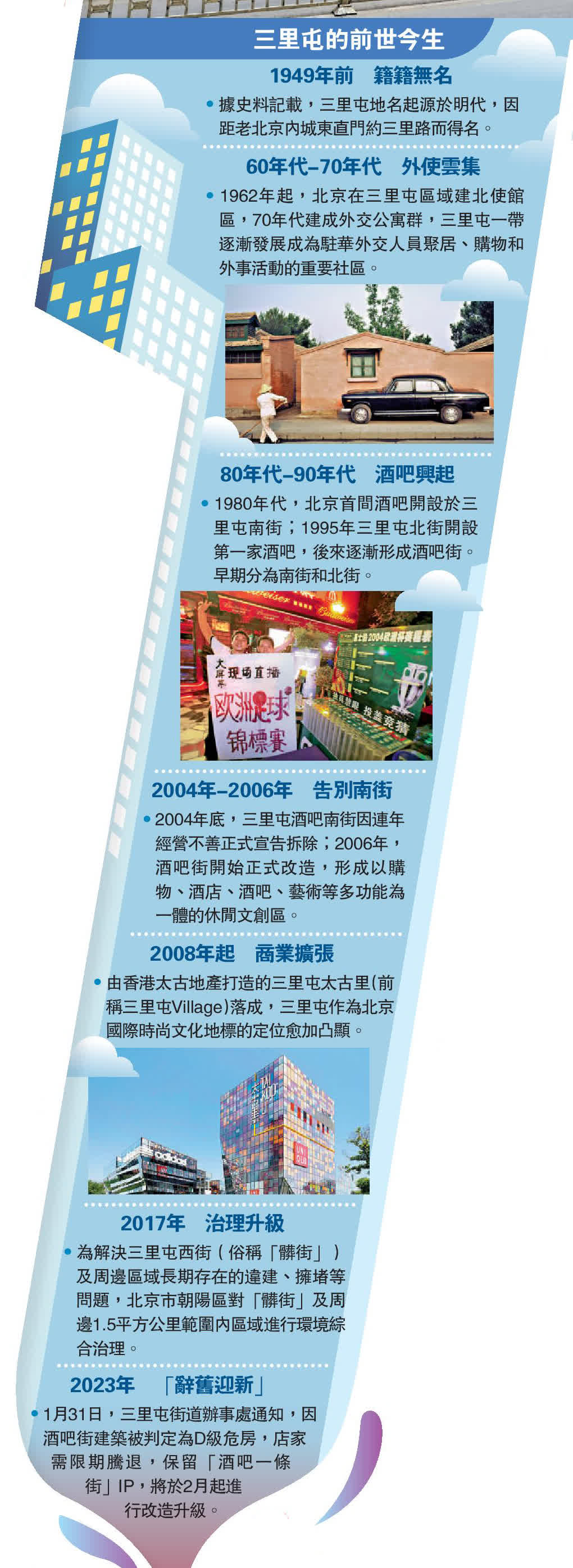 港漂譚小姐是北京人,她形容三里屯酒吧街的騰退就好似「和漸漸逝去的青春做告別」。譚小姐說,人生的第一次去酒吧、第一次去夜店,甚至偶遇明星都是在三里屯,「還有一個酒吧就叫『蘭桂坊』,讓人馬上聯想到香港的蘭桂坊。」趕上有球賽的周末,三里屯酒吧間間爆滿,「外國人也很多,曾經見到拉着行李箱的外國人剛抵達北京就到三里屯夜店。」當然,對於酒吧街關停,她表示,三里屯早就不是單一的酒吧街,還有豐富的餐飲和商店,「即便不喝酒不泡吧,三里屯也有得逛。」