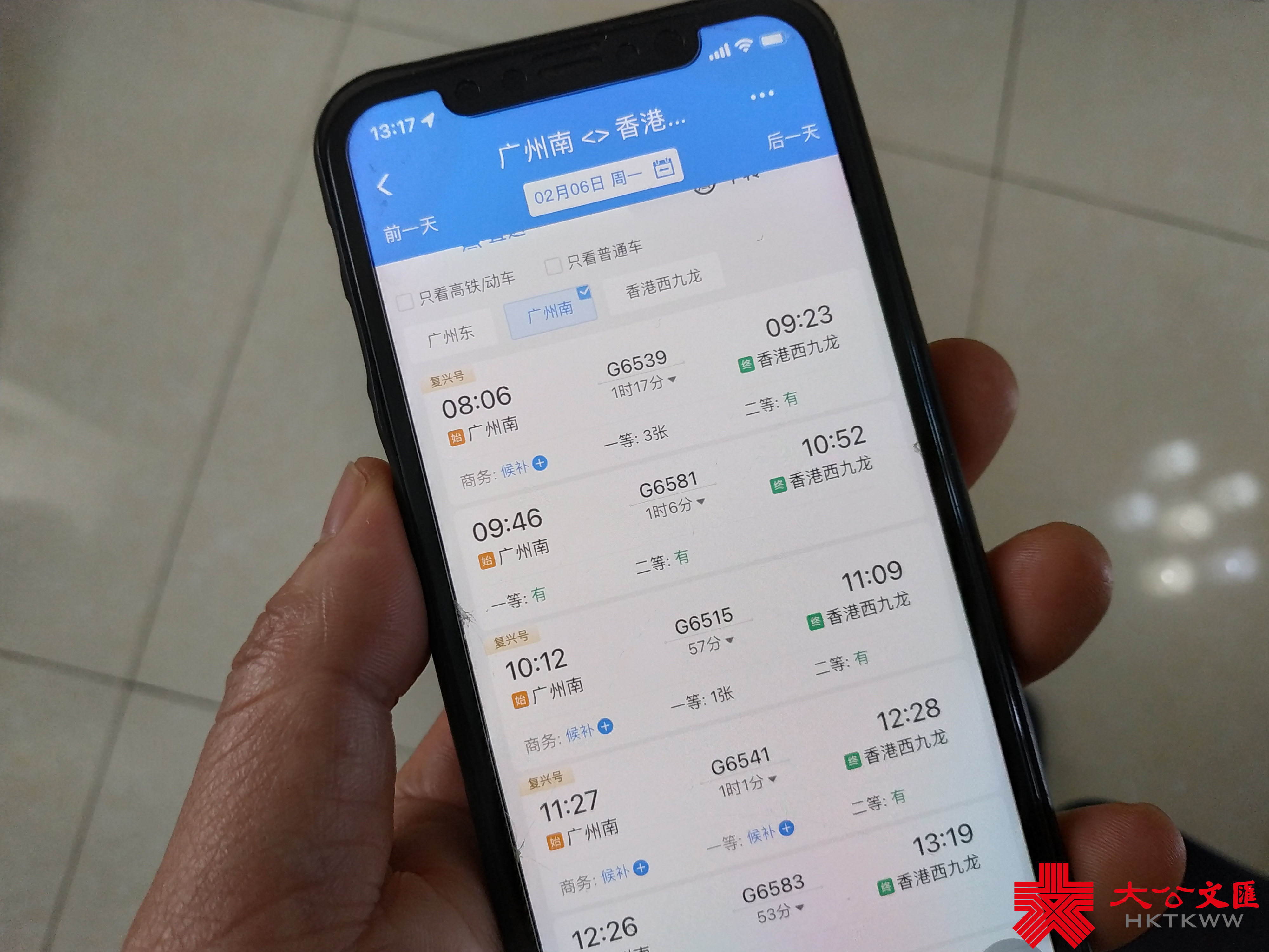 (大公文匯網記者 方俊明)國務院港澳事務辦公室宣布下周一(6日)起全面恢復內地與港澳人員往來。記者今天(3日)中午在中國鐵路12306官網查詢看到,2月5日、6日香港往返廣州高鐵的二等座餘票充足,而6日商務座車票基本處於「候補」狀態,部分車次的一等座也熱銷。鐵路人士對記者透露,香港高鐵恢復通往更多內地城市估計「很快有好消息公布」。