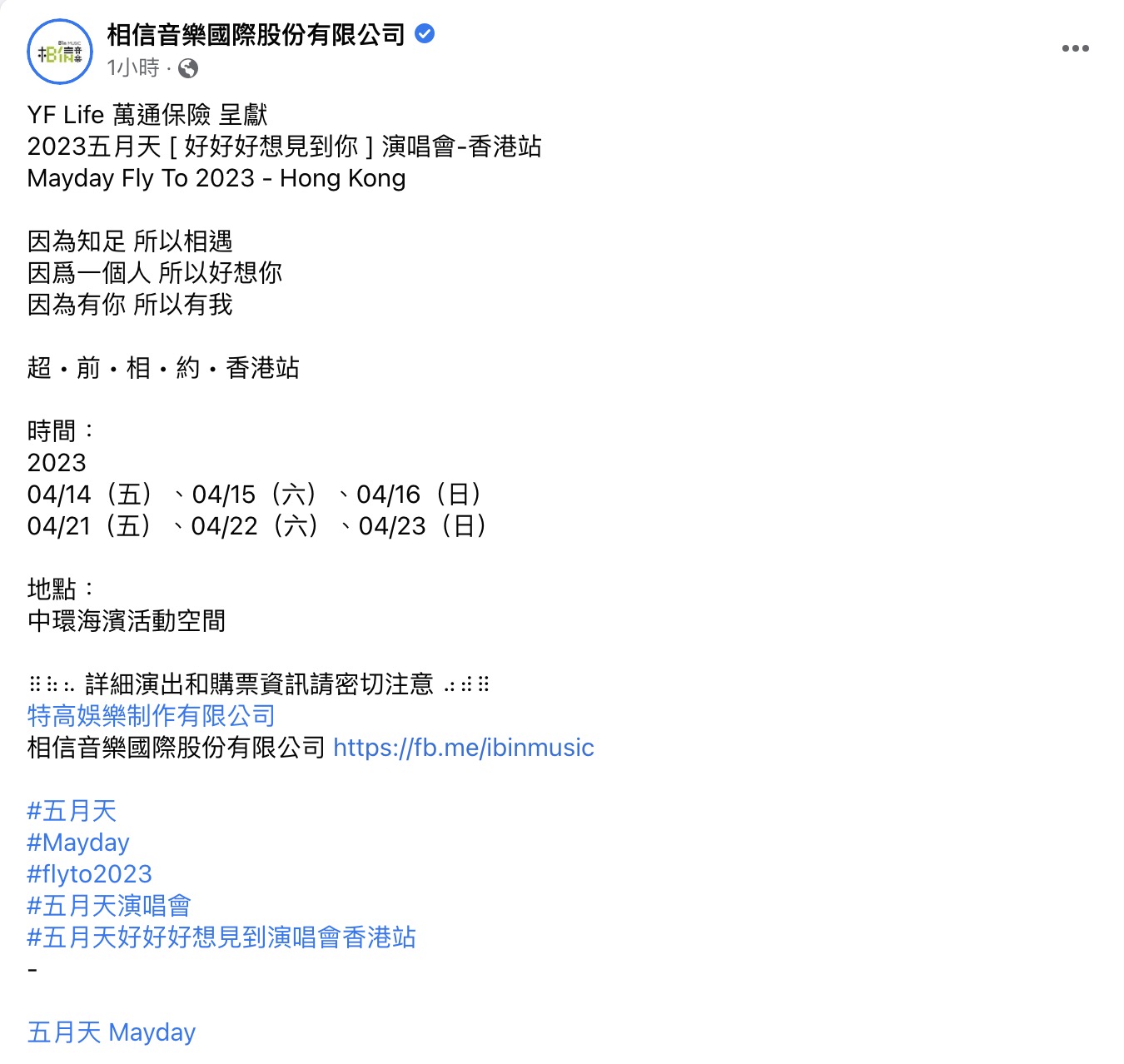 五月天今日(3日)官方宣布2023[ 好好好想见到你 ]演唱会香港站的演出安排,4月14、15、16、21、22、23日,一共6天於香港中環海濱空間舉行演唱會。五月天即將再次與香港歌迷見面,期待再創美好記憶。
