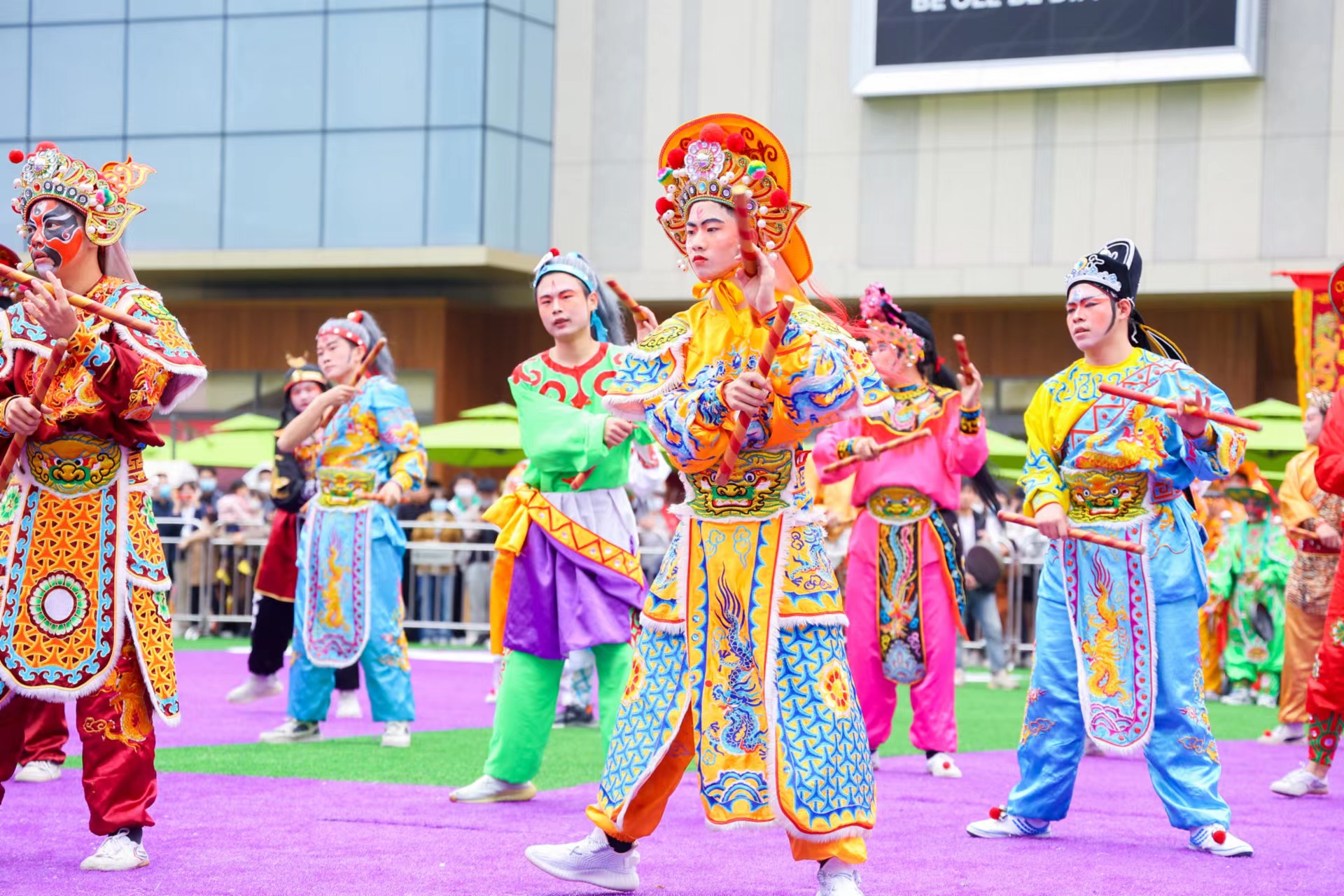伴隨着「咚咚鏘、咚咚鏘」的鑼鼓節奏,令旗迎風揮舞,古裝扮相的表演者手裏的舞槌上下翻飛、對敲而舞,不時變換隊形動作,大踏步前行。現場觀看的市民跟隨着鑼鼓聲和吶喊聲,掌聲此起彼伏、快門聲絡繹不絕。