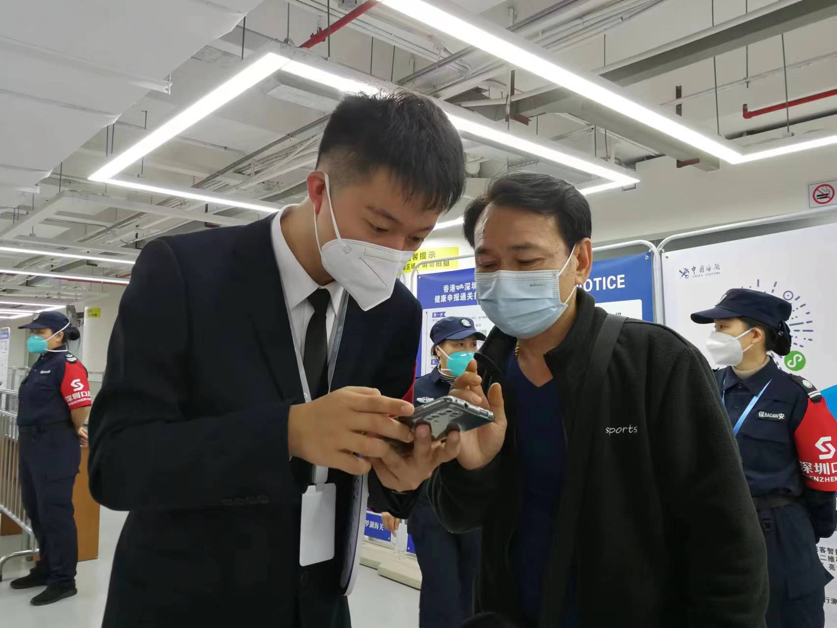 儘管不少旅客之前已知悉通關事宜,但真正等到現場填報健康申報卡時還難免遇到各種情況,比如香港手機在關口信號不好,有人不熟悉微信掃碼填資料的步驟,有的則沒有準備好內地親友電話號碼,也有老者因不會說普通話溝通花費不少時間。羅湖口岸在現場專門配備了將近10人的輔助填寫健康申報卡的團隊,他們一大早就被旅客團團圍住, 成為了今天羅湖口岸出境大廳最忙碌的人群之一。