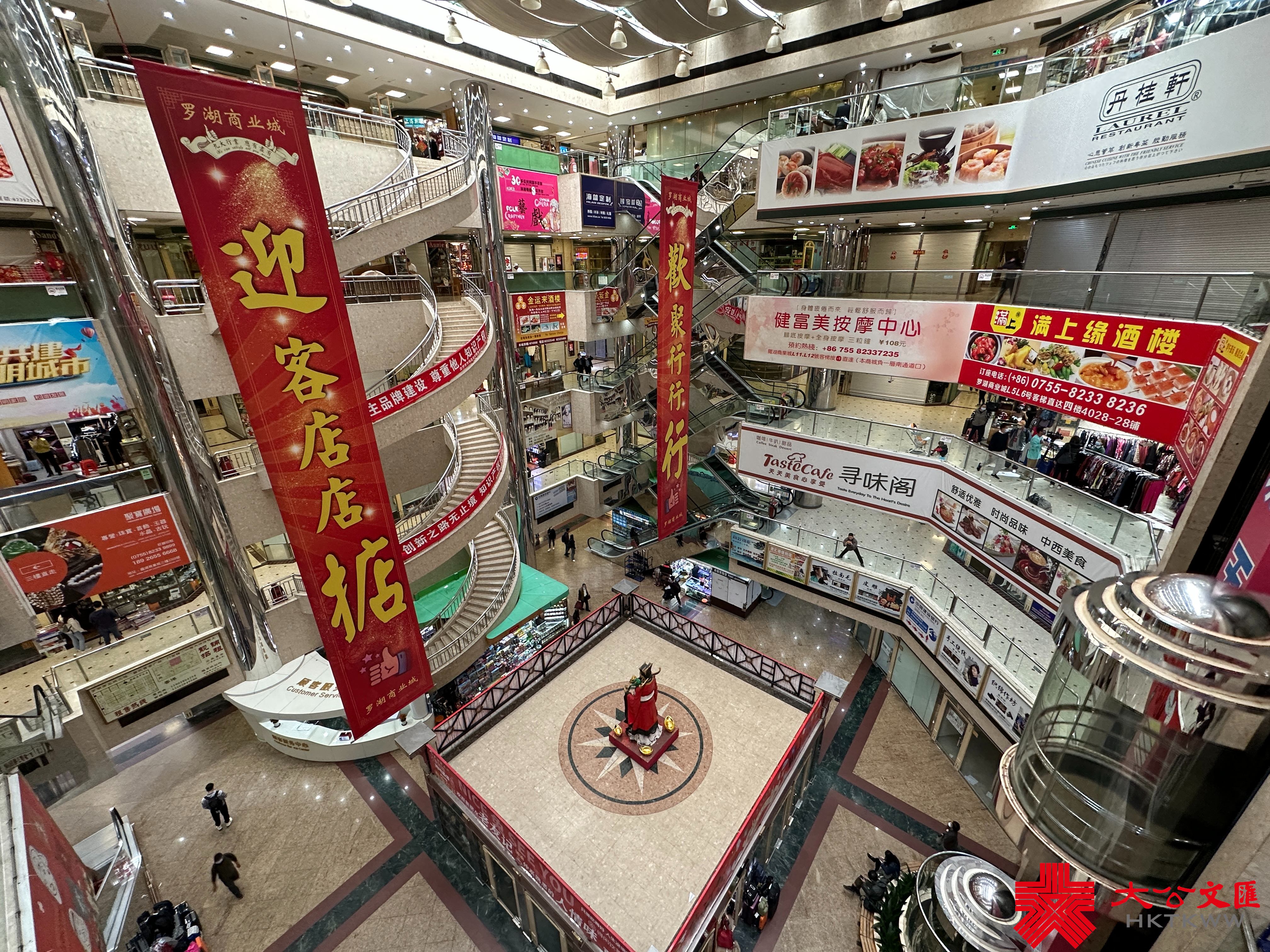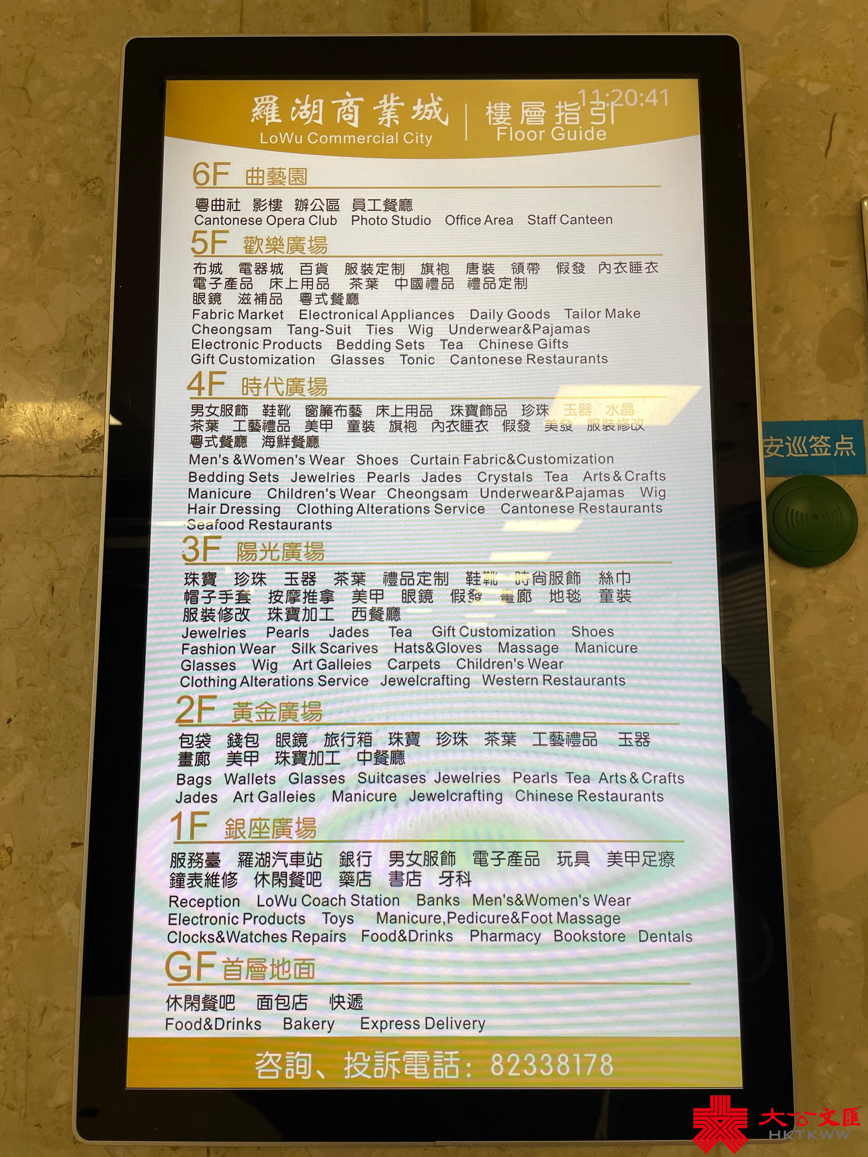 記者走訪發現,羅湖商業城地下樓層較多飲食,而一樓有銀行、美甲店、精品店,二樓多數為珠寶飾品,其餘的樓層比較多精品店,而在7樓的酒樓餐廳都未開門。