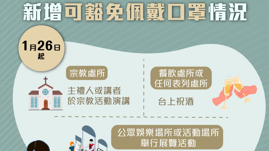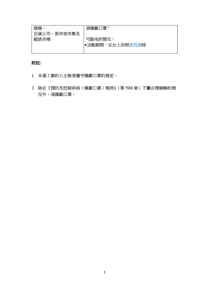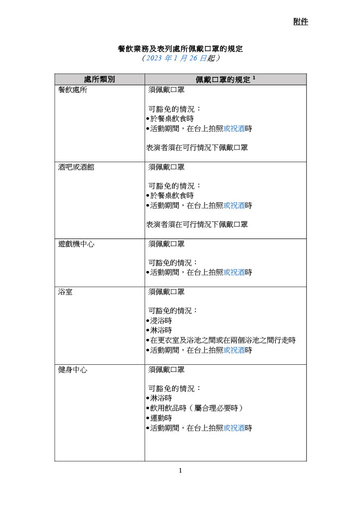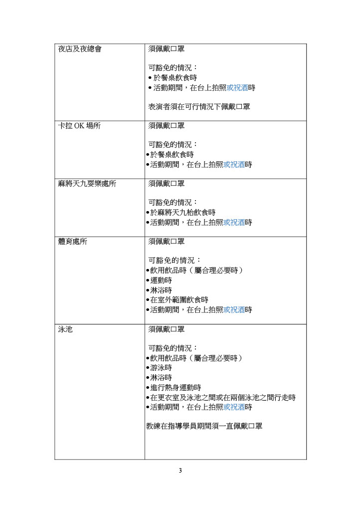 適用於餐飲業務處所及表列處所佩戴口罩的整體要求(包括可豁免的情況)如下: