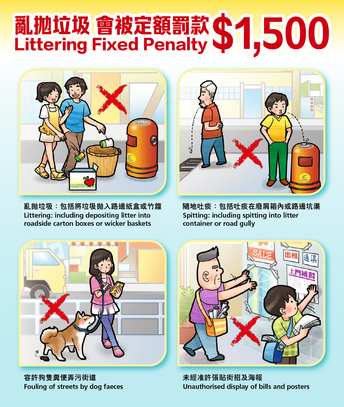 根據《定額罰款(公眾地方潔淨罪行)條例》,任何人士在香港的公眾地方亂拋垃圾、隨地吐痰、未經准許而展示招貼或海報,以及讓犬隻糞便弄污街道,處定額罰款1500元,如違例人士未能提供所需個人資料及出示身份證明而又沒有合理解釋,即屬違法,可被罰款最高5000元。遊客們需注意,在香港的公眾地方不可亂拋垃圾、隨地吐痰,不可未經准許張貼街招及海報,都有可能會被定額罰款1500元。
