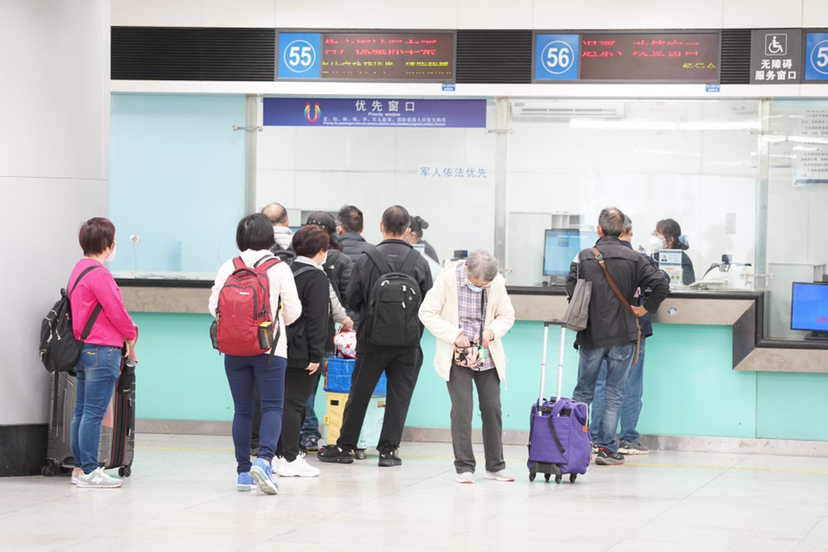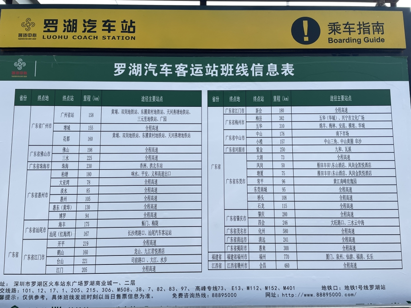 羅湖客運站內售票大屏顯示,前往廣東省內各城市如廣州、順德、佛山等地的客車都有餘票,旅客可以在人工售票處購票。