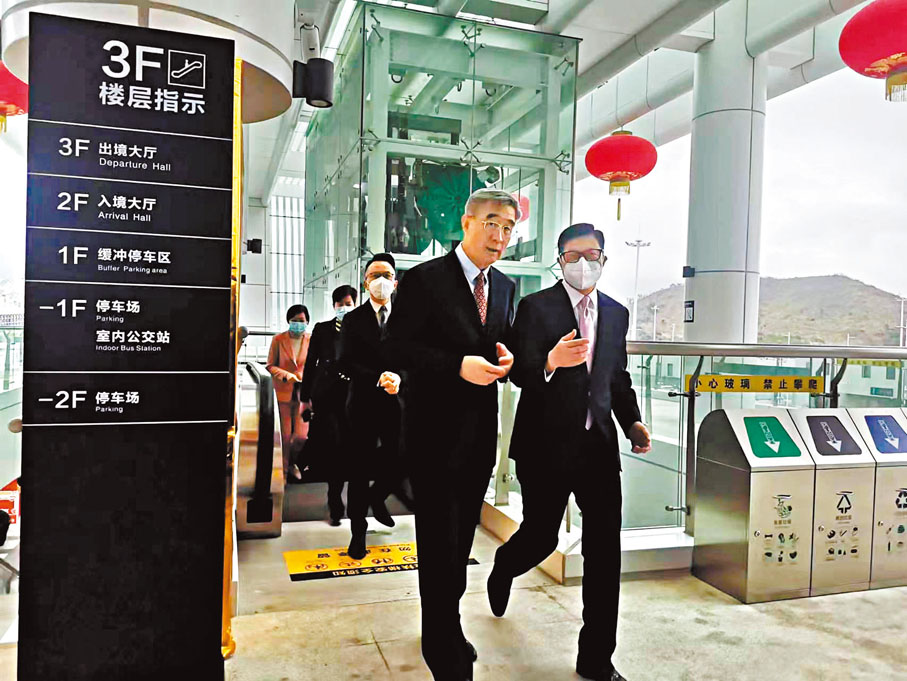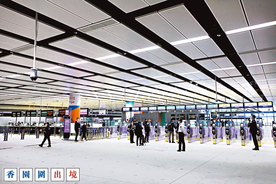 香港特區政府保安局局長鄧炳強、海關關長何珮珊等昨晨從香園圍口岸進入離境大堂,前往內地的蓮塘口岸出席客運啟動儀式。鄧炳強致辭時指,啟用客運口岸令兩地交流更暢順,對大灣區整體建設有策略性聯繫作用。
