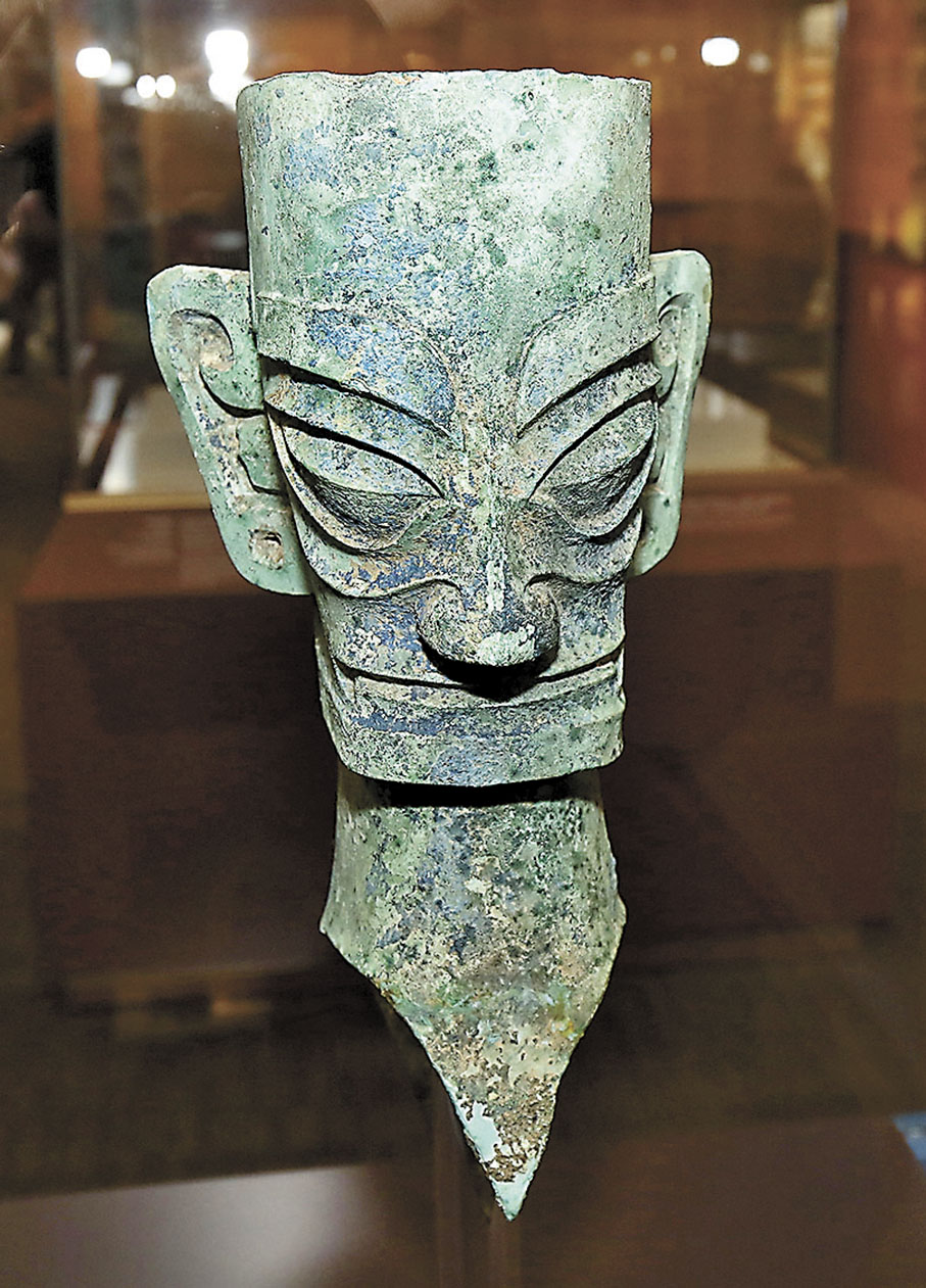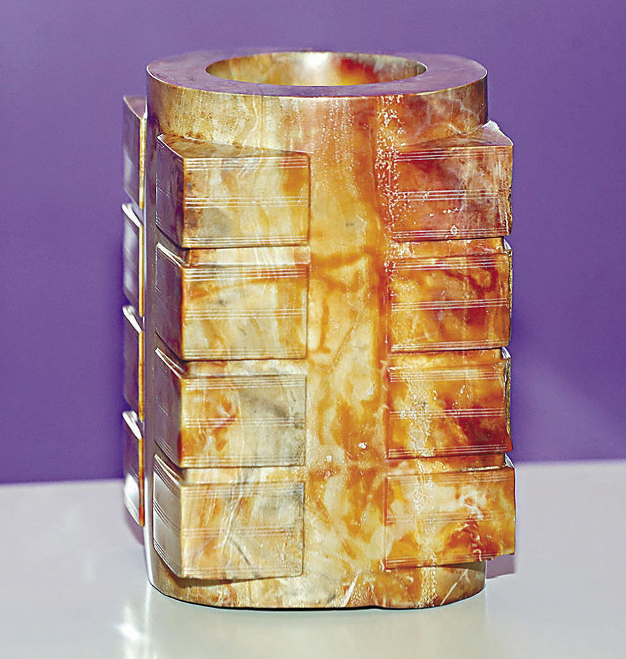 古代使用禮器,玉璧祭天,玉琮祭地。金沙遺址出土、重達3,918克的四節玉琮,由上佳整玉琢磨而成,共分四節,外方內圓,打磨得異常光滑。其形制帶有明顯的晚商玉琮特色,是數一數二的精品。晚商風格的玉琮,線條硬朗、對稱,即使是如今幾千年後觀賞,也會覺得富有當代的美感。「不少觀眾都以為玉琮是筆筒、花樽狀的,但其實它的上下兩端都是開放串通的,沒有所謂的底座,取『貫穿天地』之意。」吳卓瑩說。