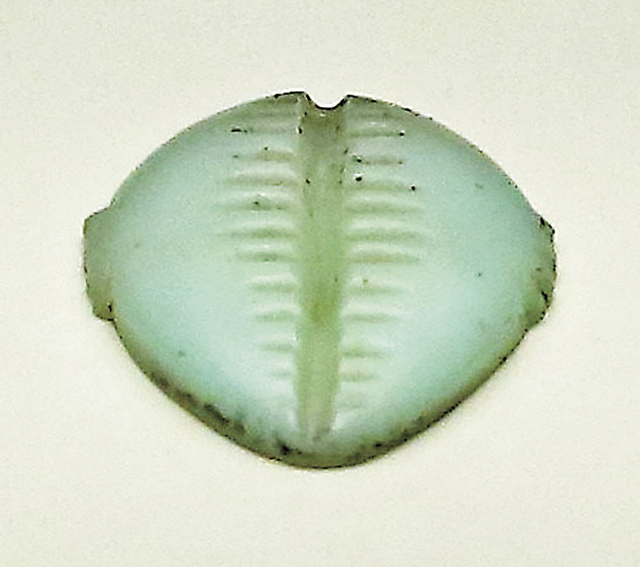 玉器區還可以見到一枚小巧玲瓏的玉海貝,青碧色澤,上有雕刻花紋,精緻逼真。古蜀是盆地,為何會有仿貝殼玉器呢?吳卓瑩說:「這足以見得他們當時已與沿海地區有交流,並且有貿易活動,才會將這罕見、得來不易的海貝作為原型製作出精美的玉器。」據悉,在金沙遺址,僅出土了四粒這樣的玉海貝。