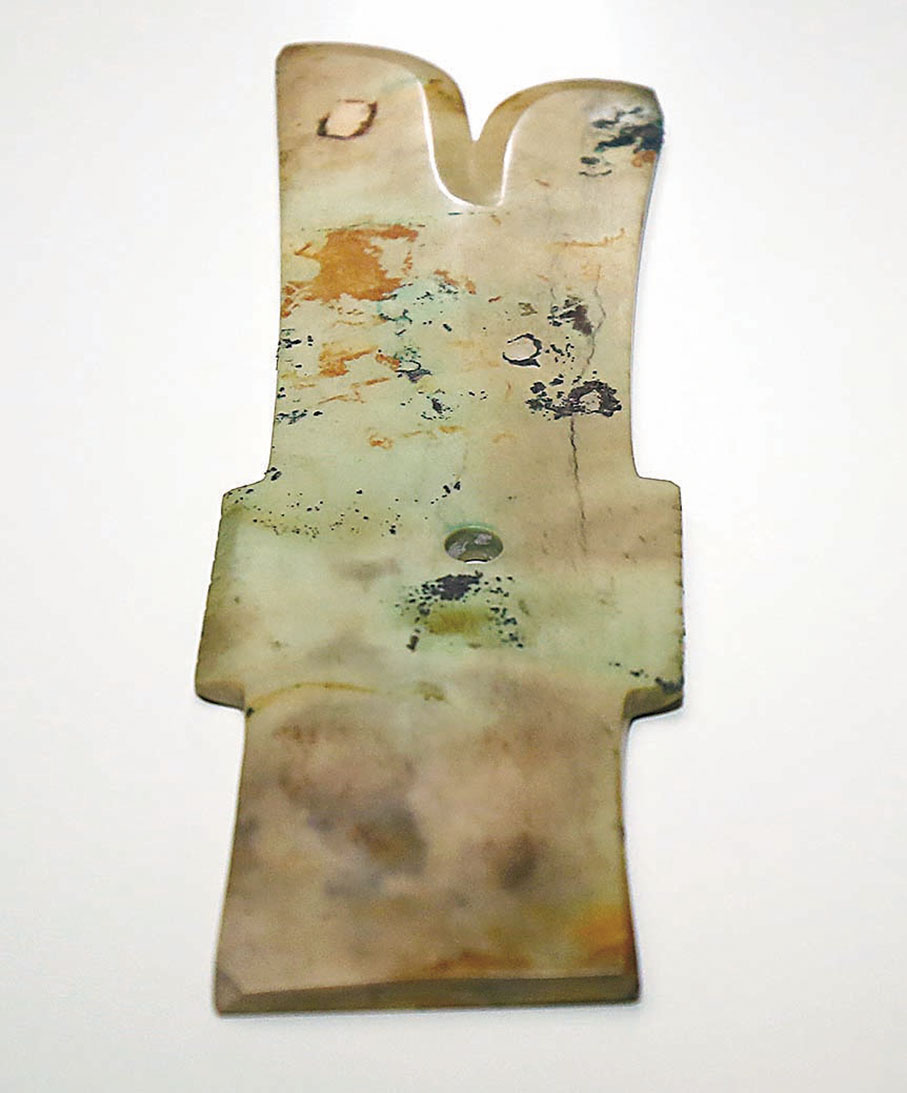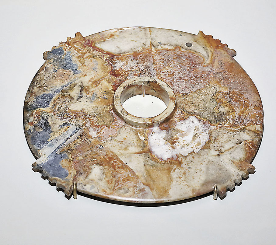 玉璧文物在中原地方很常見,但像外緣等距排列突齒狀的玉璧只有金沙遺址才有,被稱為「牙璧」。金沙出土的這塊牙璧玉石原為白色玉質,由於表面受沁,呈現出褐、黃、黑等多色斑塊。香港的這件有領石環出土自大嶼山蟹地灣,與金沙的有領玉璧相似但材質不同,估計是香港本土石製。其與長江流域出土的有領石環相似,顯示背後的相互文化交流。