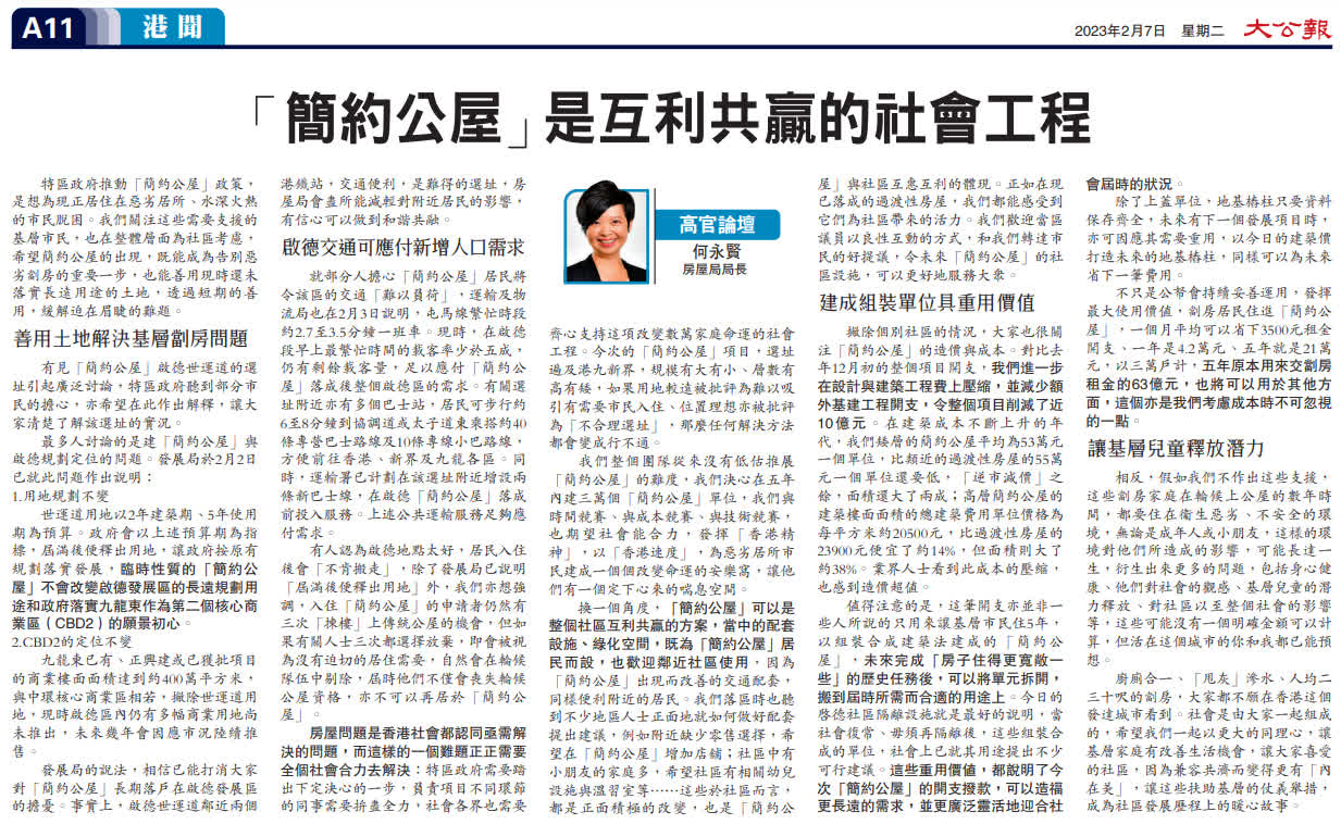 房屋局局長何永賢在《大公報》撰文,指出簡約公屋是互利共贏的社會工程。