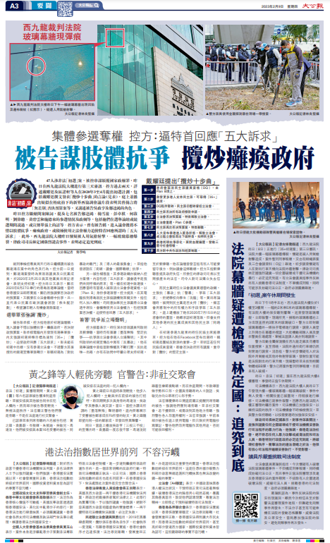 昨日控方繼續開案陳詞,提及七名被告鄭達鴻、楊雪盈、彭卓棋、何啟明、劉偉聰、黃碧雲和施德來的參選情況及政綱等,包括他們在選舉論壇或競選期間說過,或宣傳單張上的話等。控方表示,曾有被告稱,進入議會後將不惜以肢體抗爭,癱瘓政府,或積極使用立法會權力迫使特首回應所謂的「五大訴求」。此外,西九龍法院大樓昨日懷疑被人用氣槍射擊,一幅玻璃幕牆爆裂,律政司司長林定國強烈譴責事件,表明必定追究到底。