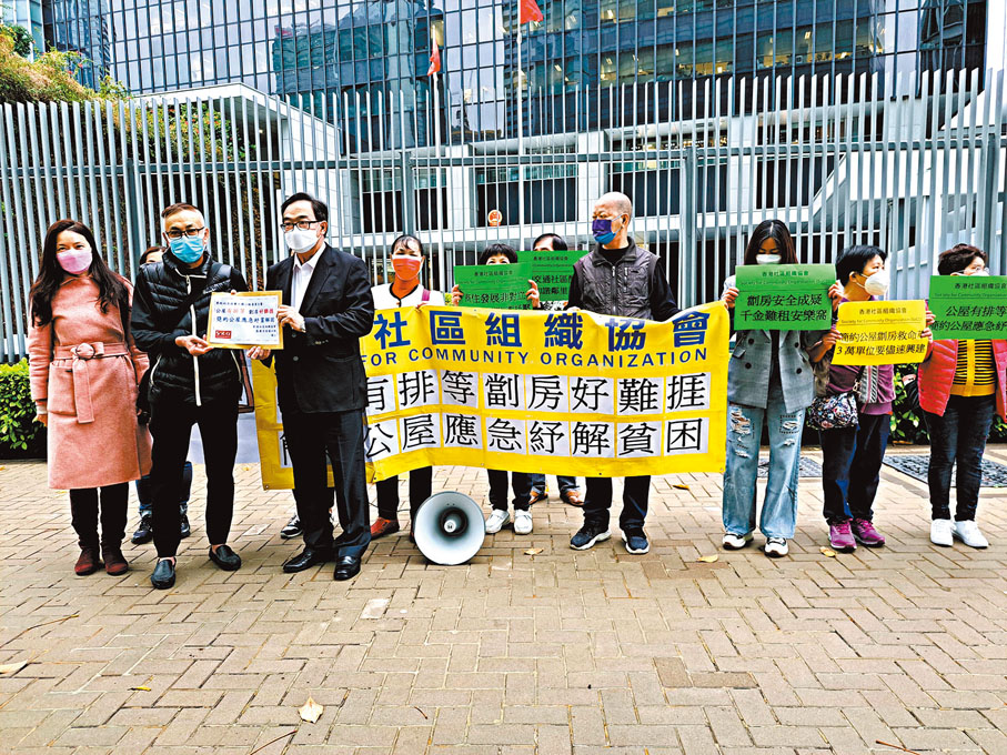 一班居於不適切居所的市民昨日在立法會工務小組會議前到立法會大樓外高呼「公屋有排等、劏房好難捱」、「簡約公屋紓貧解困」等口號,促請政府盡快推展「簡約公屋」。