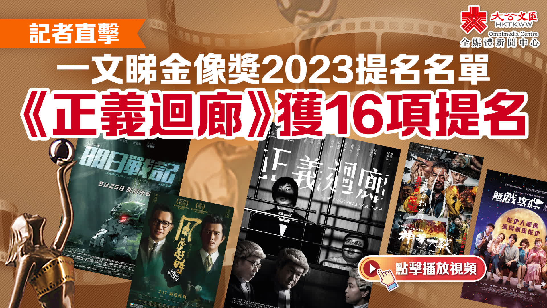 今年共有33套電影入圍角逐各個獎項,其中《正義迴廊》獲得16項提名成為本屆之冠,而《神探大戰》、《飯戲攻心》及《明日戰記》亦各有11項提名。近日有不少爭議的紀錄片《給十九歲的我》逆風入圍「最佳導演」、「最佳電影」、「最佳剪接」三項大獎。
