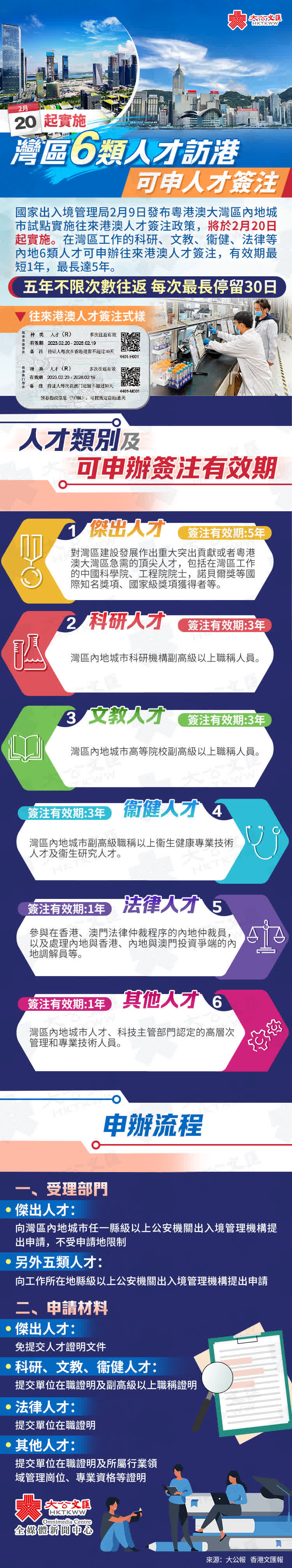 (大公報 記者 趙一存、方俊明、鍾怡、邵穎)國家出入境管理局9日發布粵港澳大灣區內地城市試點實施往來港澳人才簽注政策,將於2月20日起實施。在灣區工作的科研、文教、衞健、法律等內地6類人才可申辦往來港澳人才簽注,有效期最短1年,最長達5年,持證人在簽注有效期內可以不限次數往來香港或者澳門,每次在港或澳停留可達30天。廣州衞健及科研人才受訪時表示,「人才簽注」較目前赴港澳個人遊簽注「大大放開」,促進灣區人才交流與合作。
