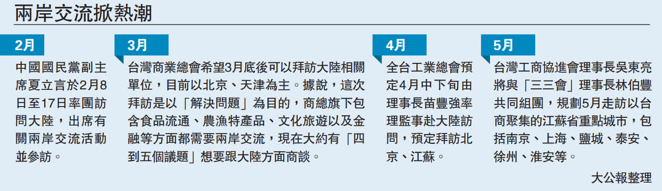 其中,台灣商業總會預計3月底赴陸,台灣工業總會安排在4月中下旬,「三三會」與工商協進會共同組團,規劃5月走訪台商聚集的長三角地區。
