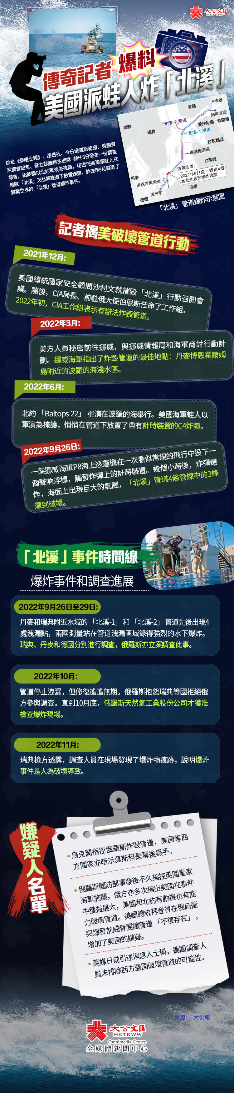 大公報綜合《泰晤士報》、路透社、今日俄羅斯報道:美國資深調查記者、普立茲獎得主西摩·赫什8日發布一份調查報告,指美國以北約軍演為掩護,秘密派遣海軍蛙人在俄歐「北溪」天然氣管道下放置炸彈,於去年9月製造了震驚世界的「北溪」管道爆炸事件。赫什稱,一架挪威軍機協助美國遙控引爆了炸彈。這份報告引起國際社會關注,白宮立即出面否認,俄羅斯則要求白宮解釋其在爆炸事件中扮演的角色。