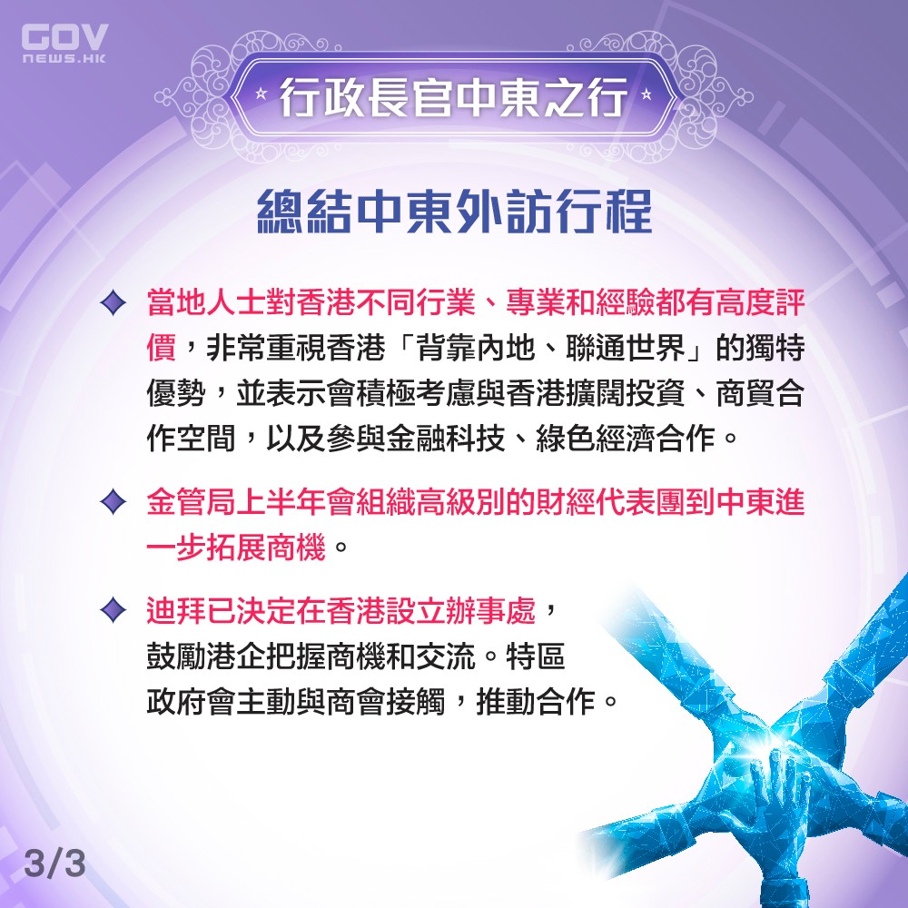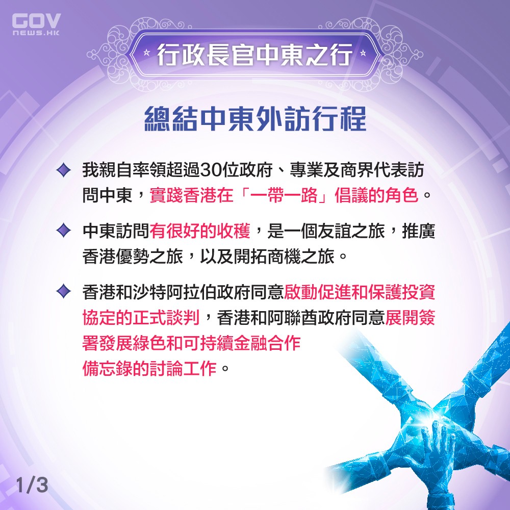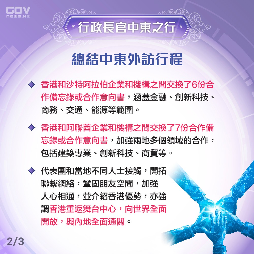 政府在社交平台發圖,總結今次中東之行的收穫: