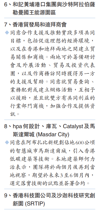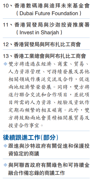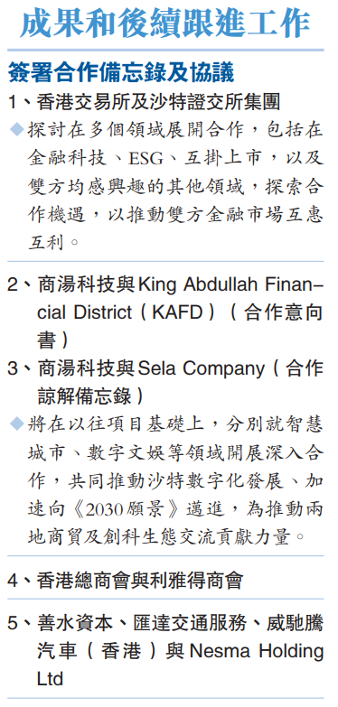 此行收穫頗豐,包括香港與沙特阿拉伯政府已同意啟動促進和保護投資協定的正式談判,香港與阿聯酋政府也同意就簽署發展綠色和可持續金融合作備忘錄展開討論;在商界和專業界別,香港和沙特的企業、機構之間交換六份合作備忘錄或合作意向書,涵蓋金融、創新科技、商務、交通、能源等範疇;香港和阿聯酋的企業、機構之間也交換七份合作備忘錄或意向書,加強兩地在建築專業、創新科技、商貿等多個領域的合作。