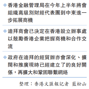 李家超透露,金管局上半年會組織高級別的財經代表團到中東進一步拓展商機,迪拜方面亦已決定在香港設立辦事處。他鼓勵港企把握商機和交流,特區政府會主動與商會接觸,推動合作。他提到,特區政府在迪拜的經貿辦亦會深化與當地的良好關係,擴大和鞏固聯繫網絡。